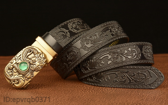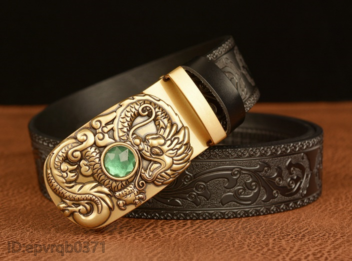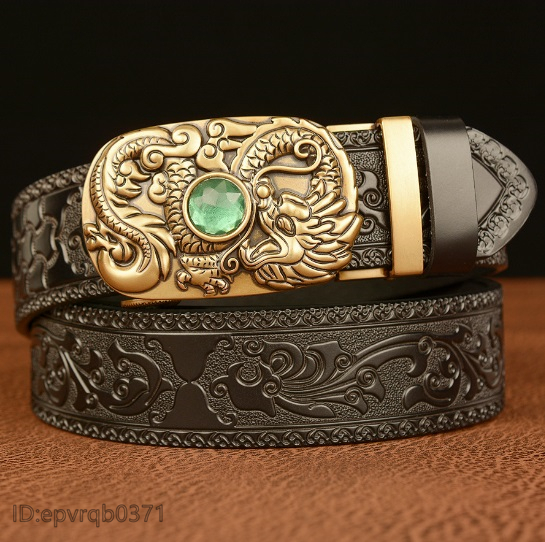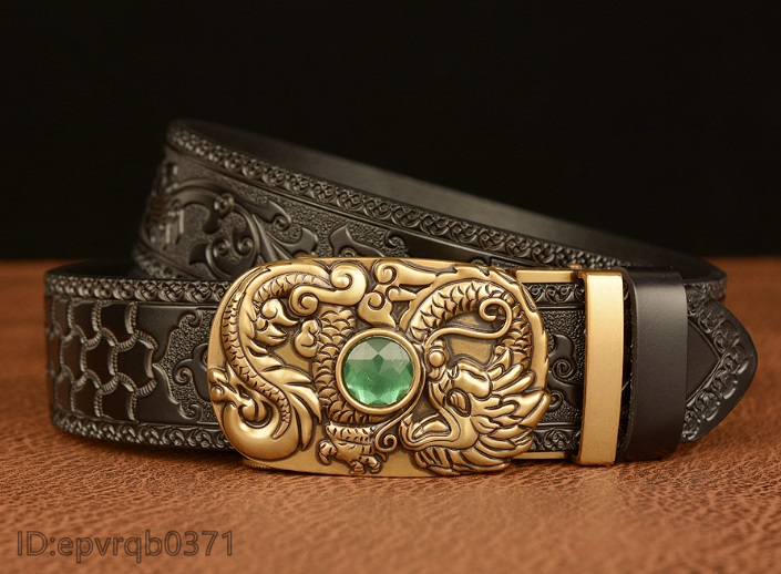 レザーベルト◆新品 オートロック式 バックル ドラゴン龍 本革 宝石飾り メンズベルト 幅3.5センチ 紳士 長さ調整可能 /黒