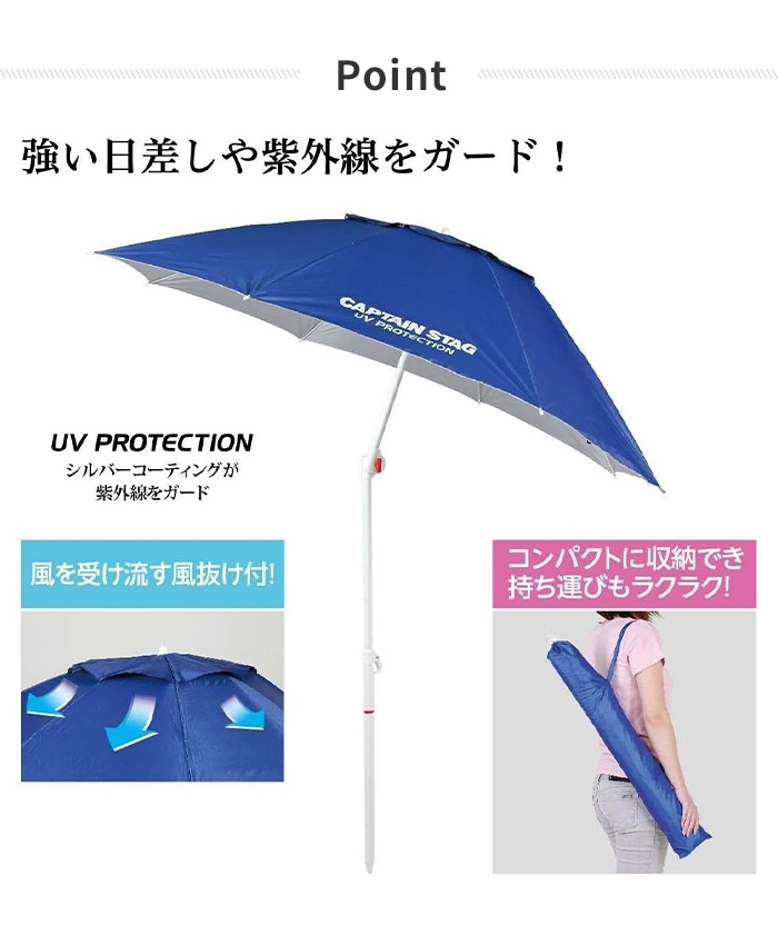 | 強い日差しや紫外線をガード。 シルバーコーティングが紫外線をガード。 風を受け流す風抜け付。 コンパクトに収納でき持ち運びもラクラク。 |