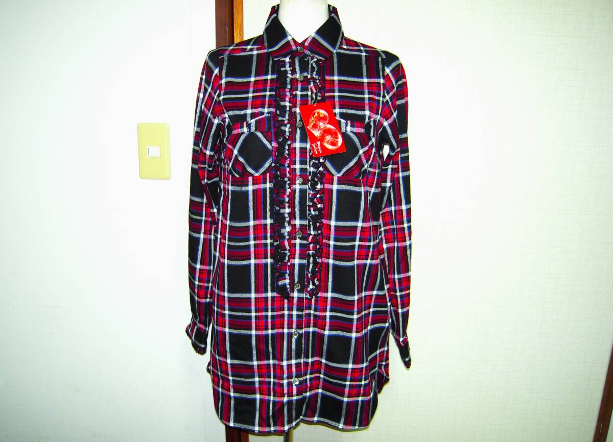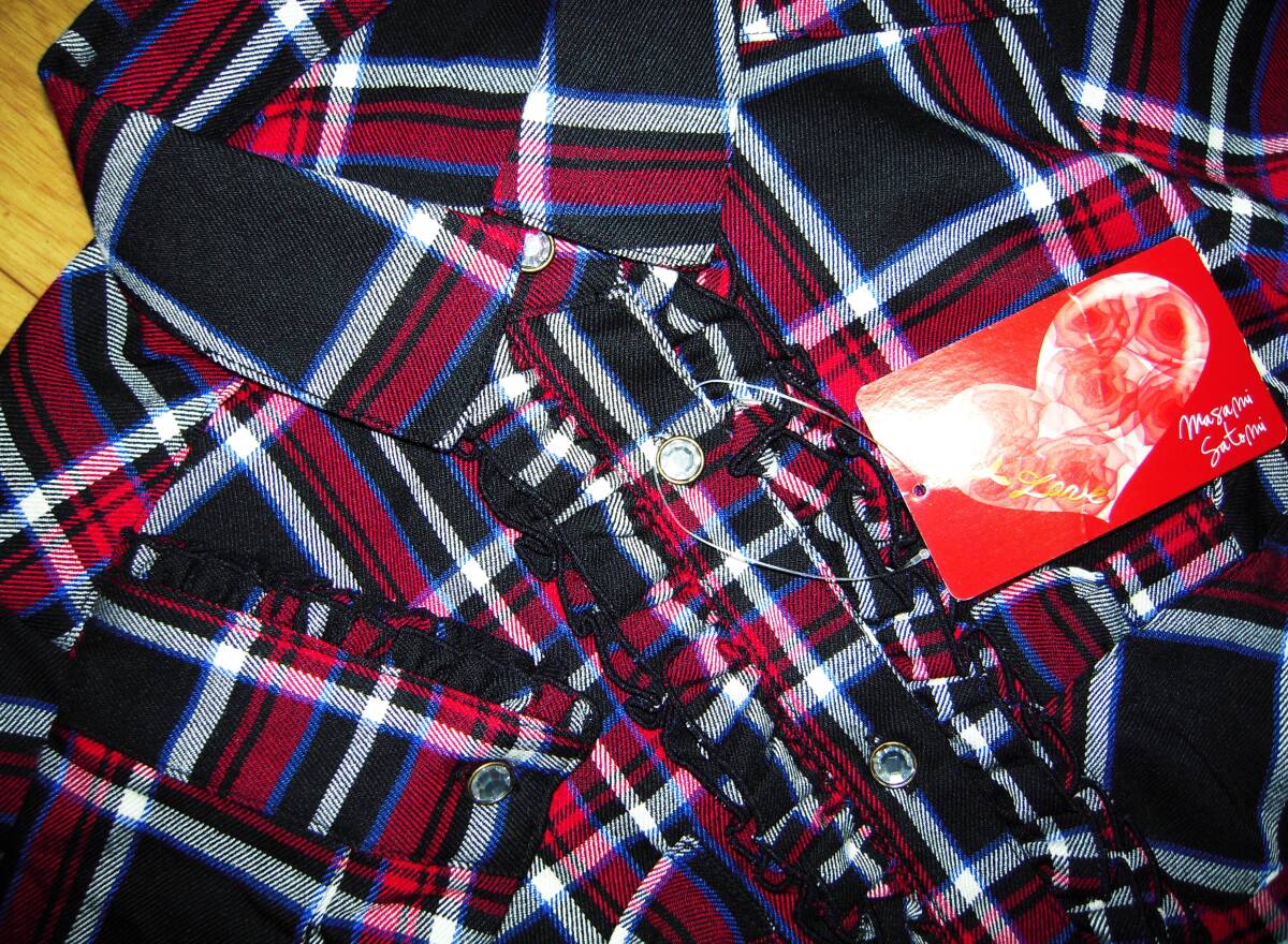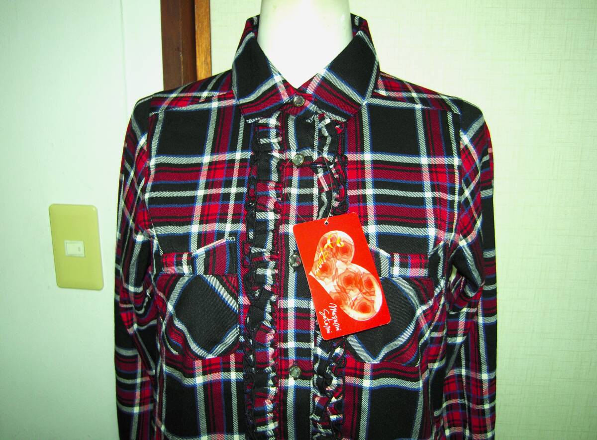 masami satomi マサミサトミ 未使用 新品 長袖 シャツ ロング丈 オンワード樫山 ガラスカット釦 タータンチェック フリル ポケット付 S