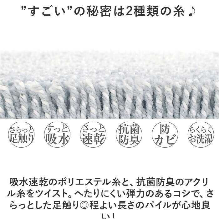 | 商品説明 | ・・悩んだら選んで♪機能的で毎日快適に使える「実はすごいバスマット」Mサイズが新登場。 ・【”すごい”の秘密は2種類の糸♪】 ・吸水速乾のポリエステル糸と、抗菌防臭のアクリル糸をツイスト。へたりにくい弾力のあるコシで、さらっとした足触り◎程よい長さのパイルが心地良い! ・【丸洗いできてお手入れ簡単】 ・汚れが気になったら、洗濯ネットに入れて丸洗いOK。抗菌防臭加工済みで、いつも清潔をキープ。(※弱モードで単独洗いしてください。ドラム式洗濯機では洗濯や脱水ができない場合ごございます。) ・【洗濯後も乾きが速く手軽に使える!】 ・洗濯後の乾きの速さもポイント。洗い替え用を揃えなくても大丈夫。 ・【滑り止め&防カビ機能で安心・安全】 ・マット裏は滑りにくい素材で、いや~なズレを軽減。カビを抑制する防カビ機能もプラス。(※全ての細菌・カビ菌に対して効果があるわけではありません。) ・【空間に馴染むナチュラルデザイン】 ・優しい色合いのニュアンスカラーを使った、シンプルなデザイン。熟練した技術で1枚ずつ丁寧に手作りした、こだわりのバスマット! |