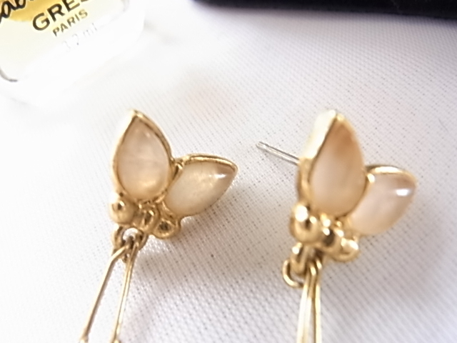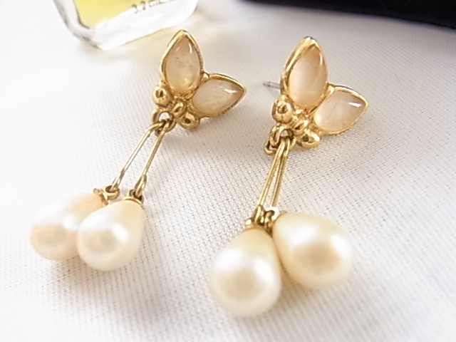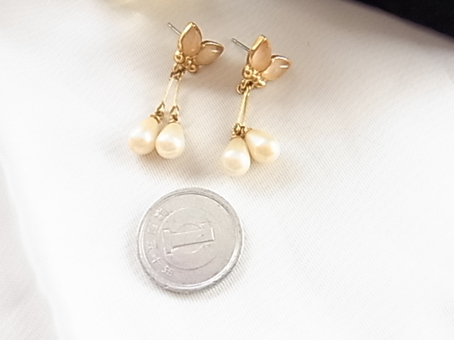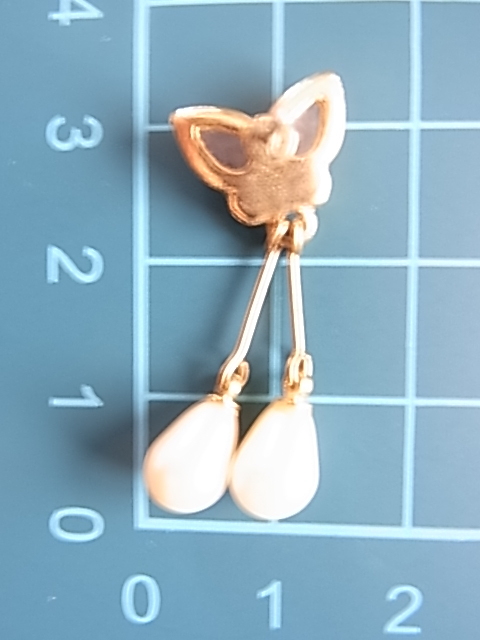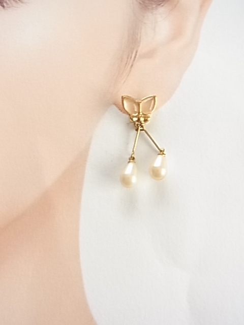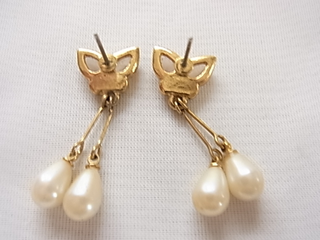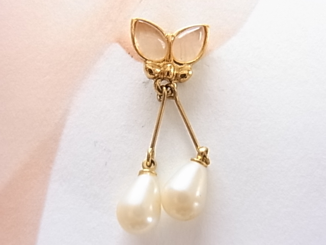 ビンテージ/ヴィンテージ 雫形のfakeパールが2粒揺れる 薄い桃色の蝶々モチーフ バタフライデザイン キュートな印象 ピアス▽