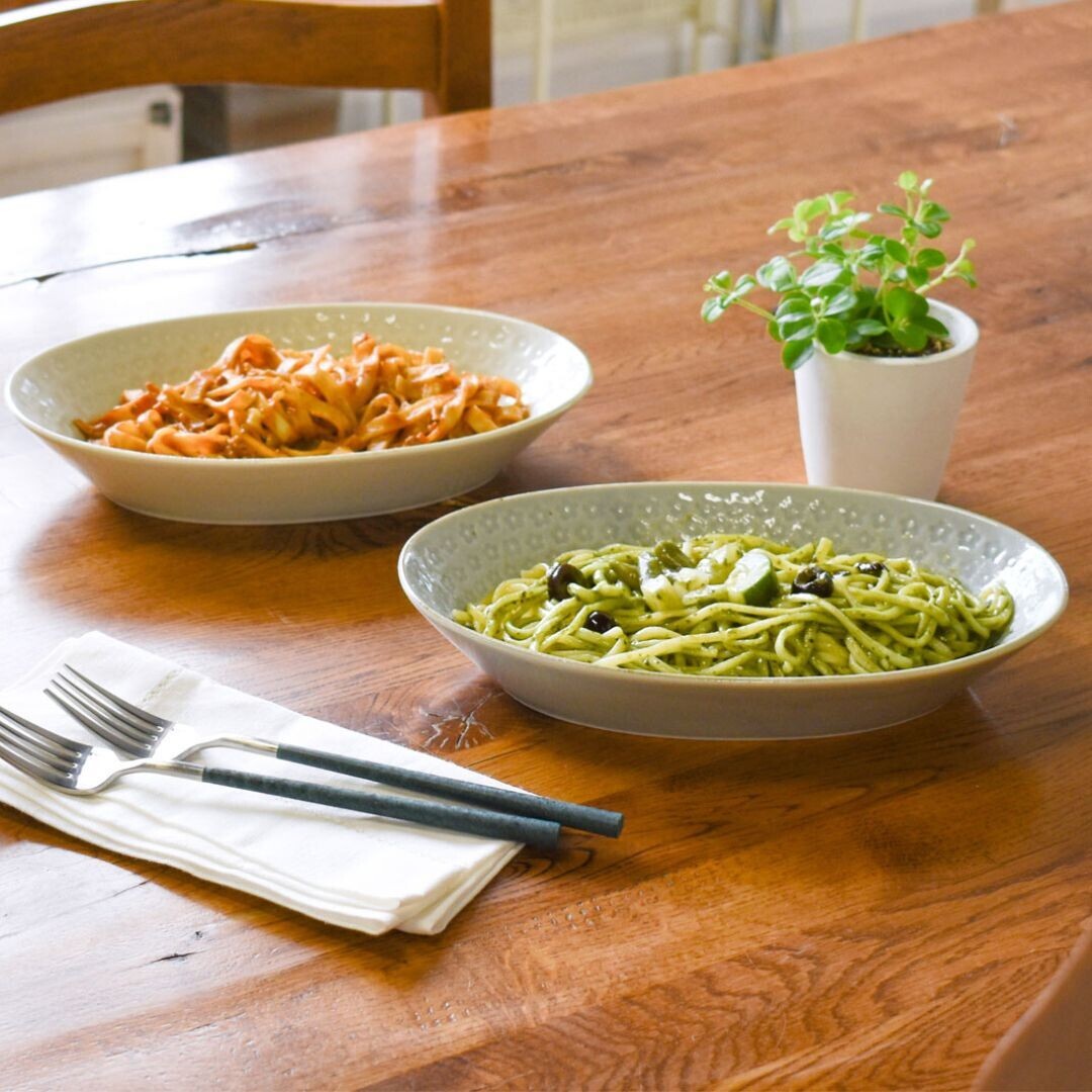 【やさしい色合いで落ち着きのある色味のオーバルボウルのペアセット】