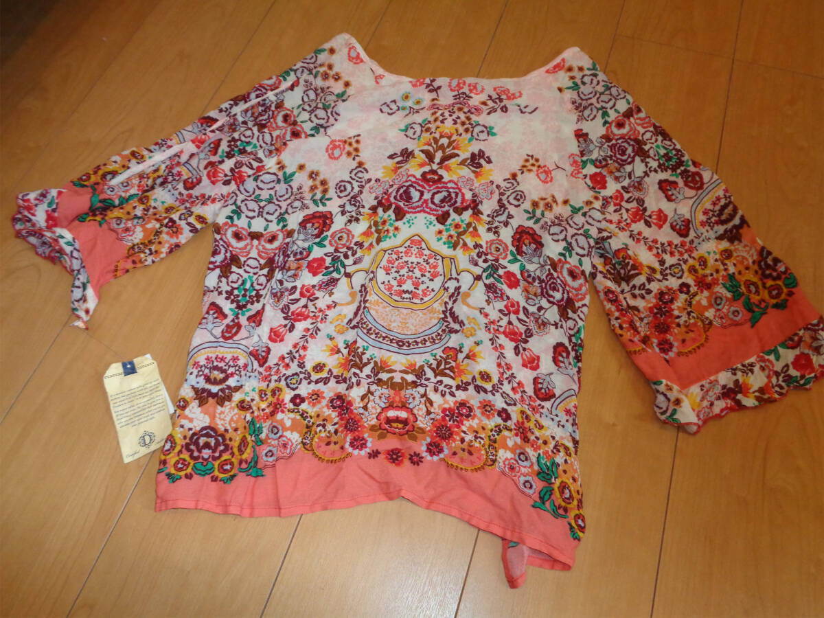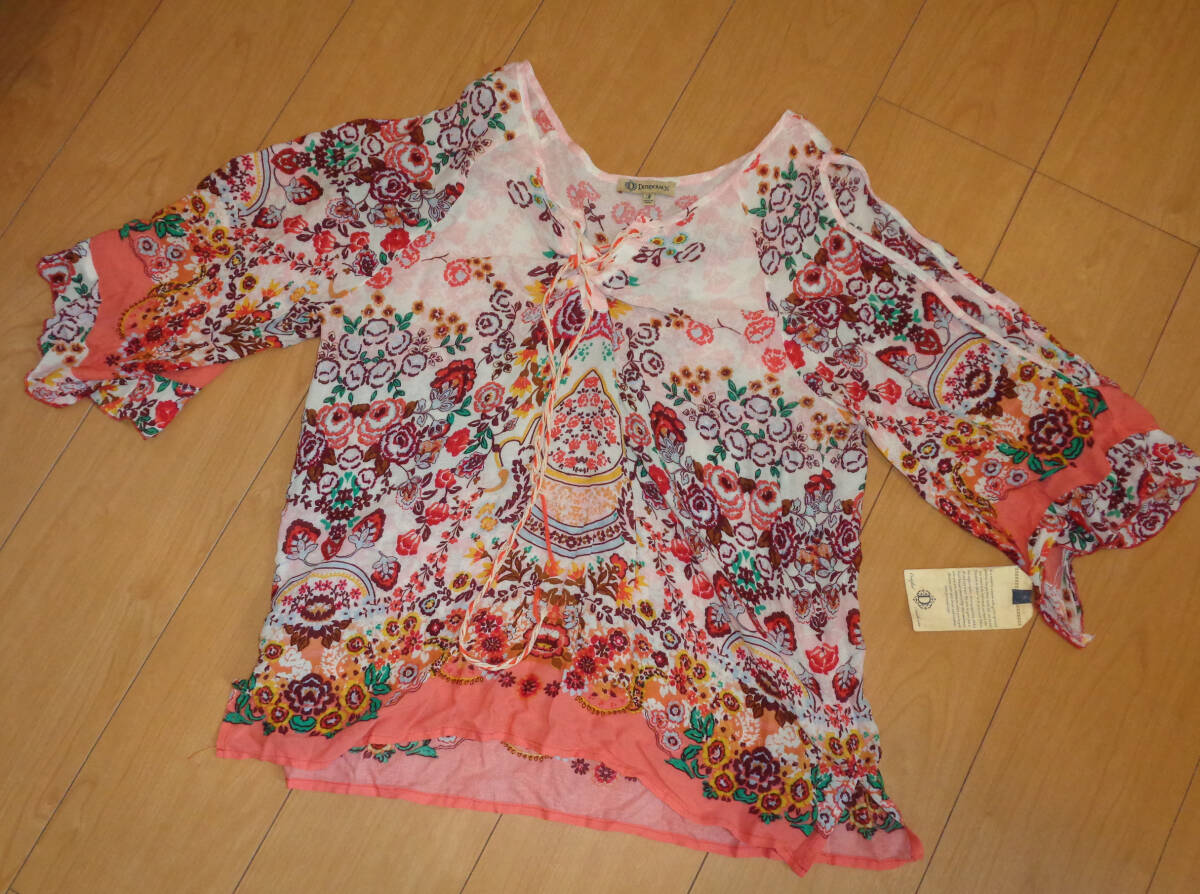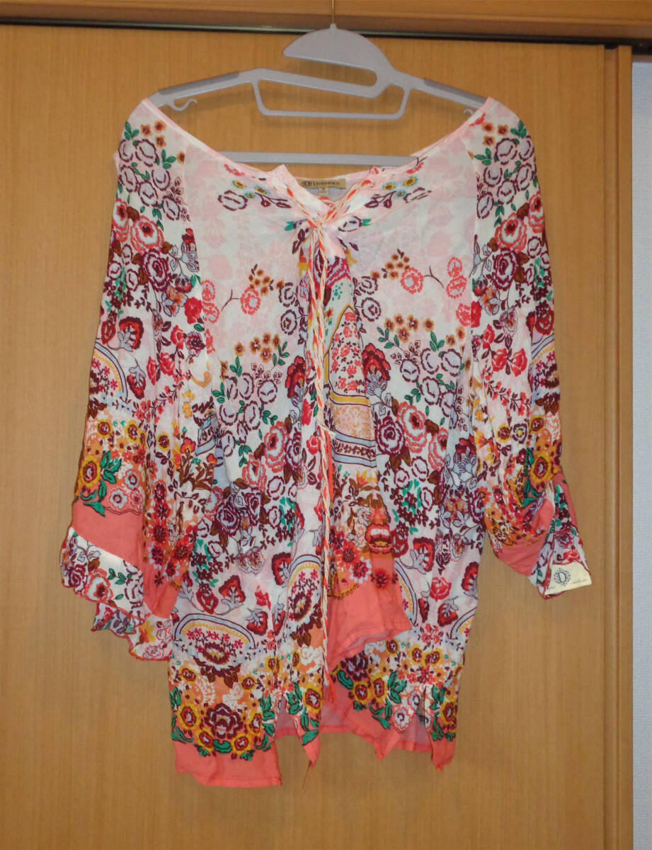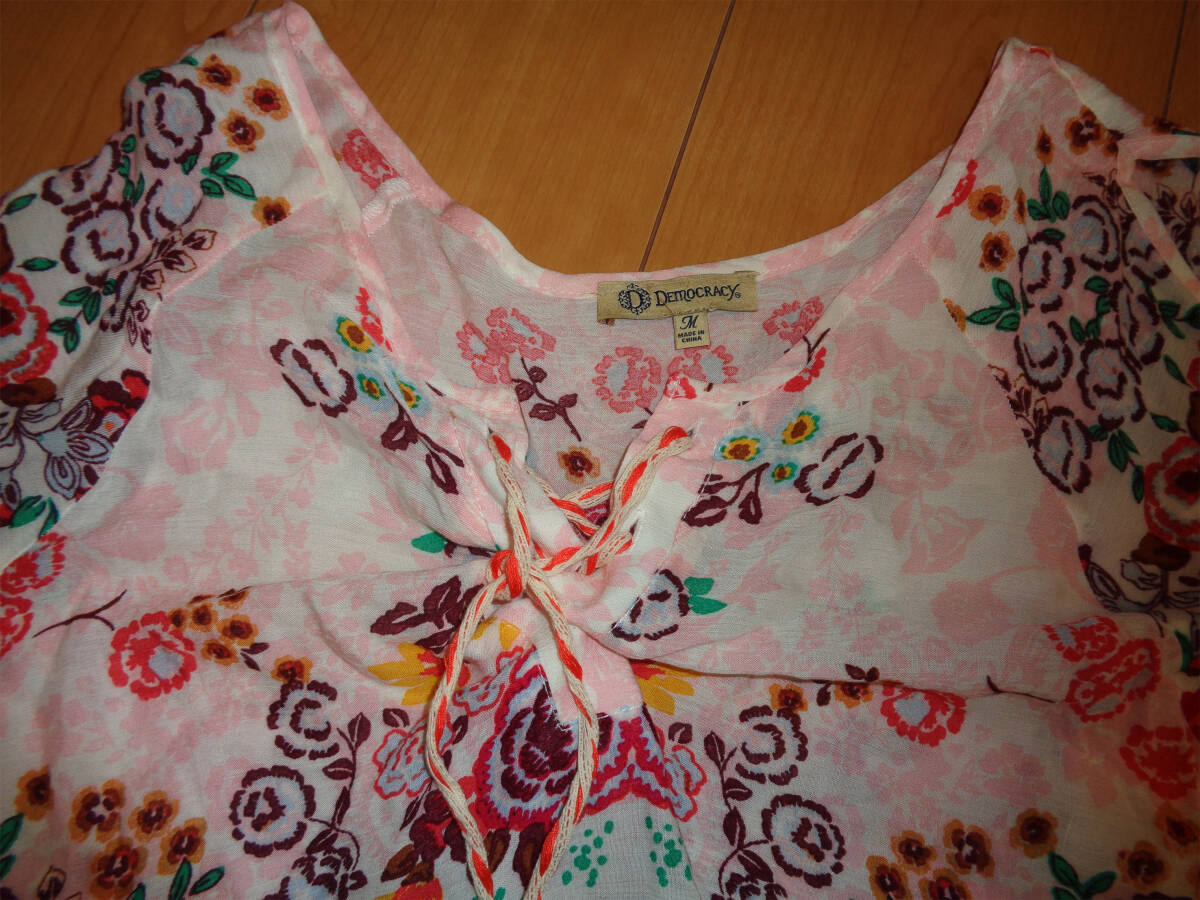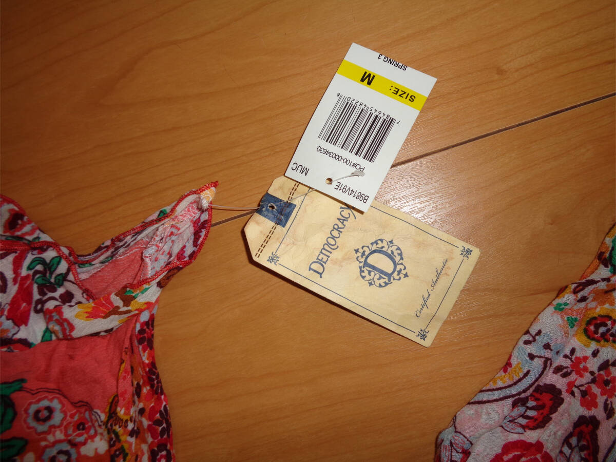 海外購入の商品でサイズはUS Mのカットソーになります。タグにはDEMOCRACYとあります。薄手の商品ですので1枚での着用だとインナーが透けてしまいます。4枚目画像参照で袖が空いてます。