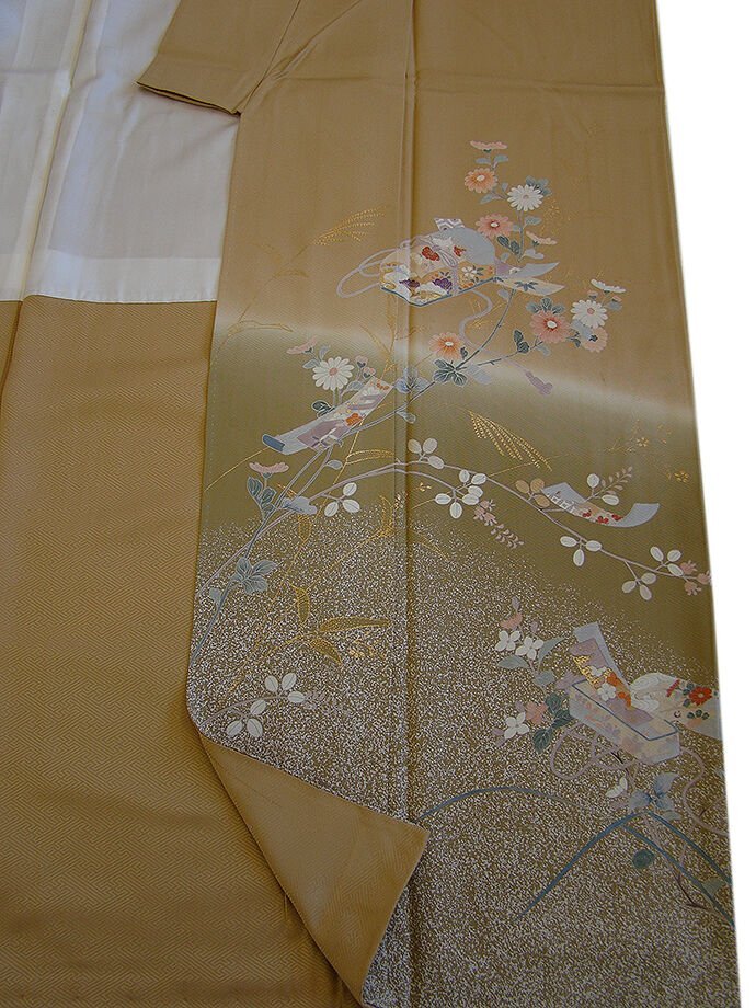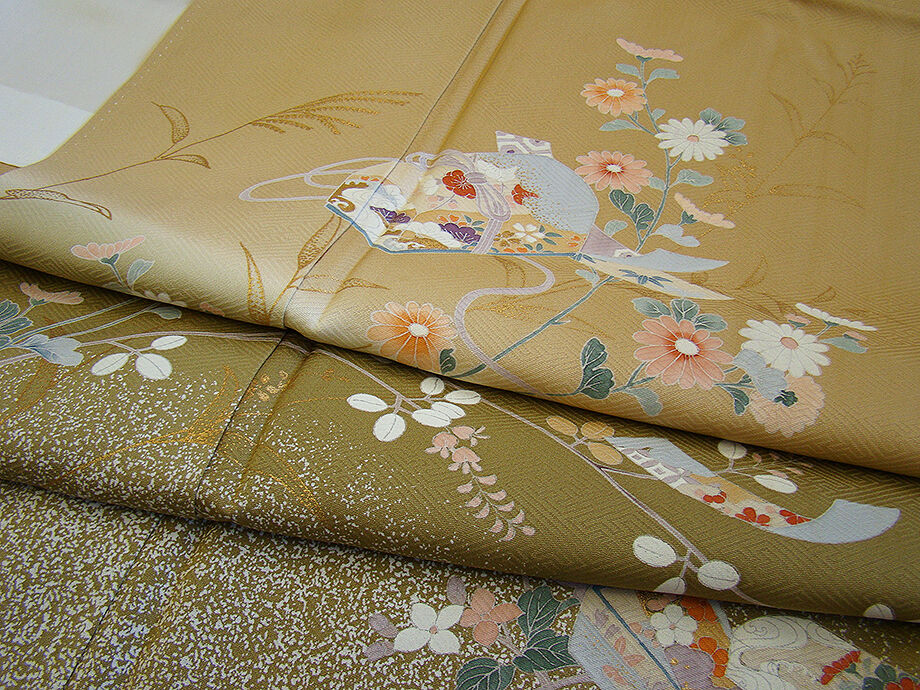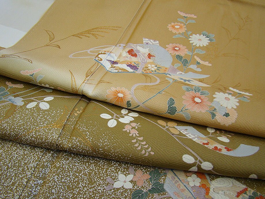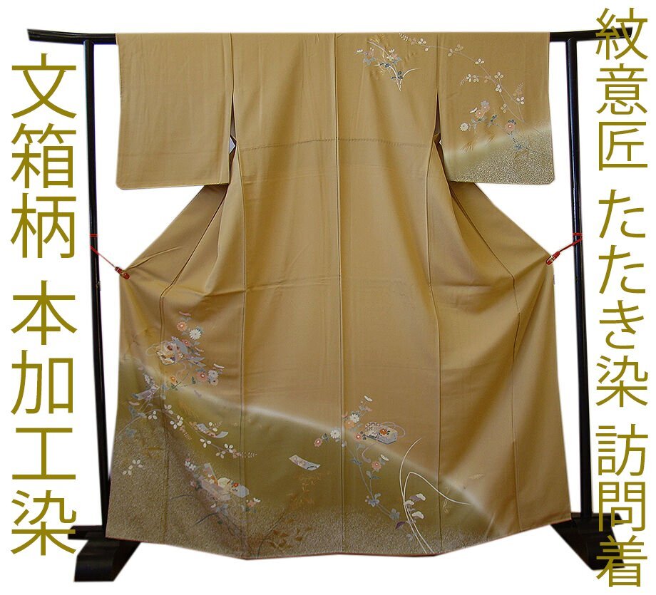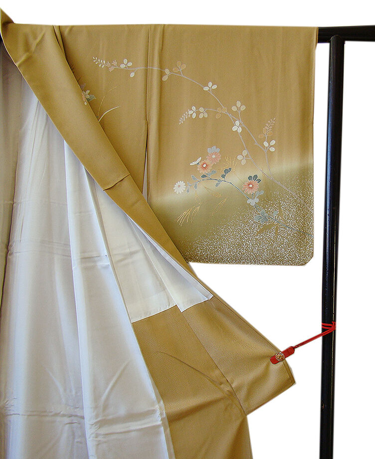 | 商品説明 | こちらのお品は「袷」ですので10月から5月までお召頂ければと思います。 大変にしなやかで柔らかな手触り良い滑らかな重めの紋意匠地の生地、 薄い黄橡色地に裾にかけて国防色ぼかし染に白色のたたき染に、 文箱に花木柄の本加工染に金彩加工仕立て、 共八掛(正絹)、幅広い年代の方にお召頂けます。 |