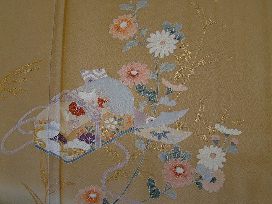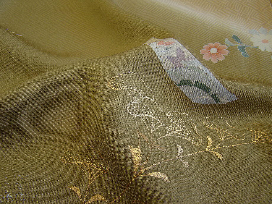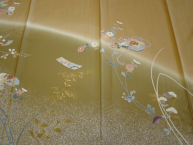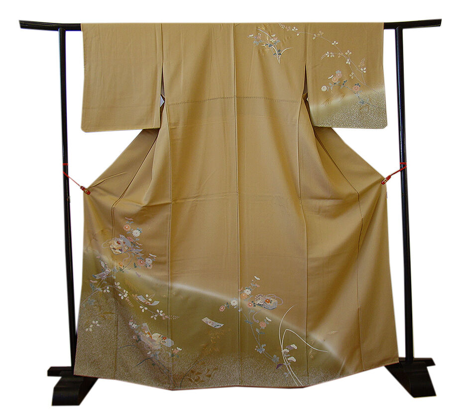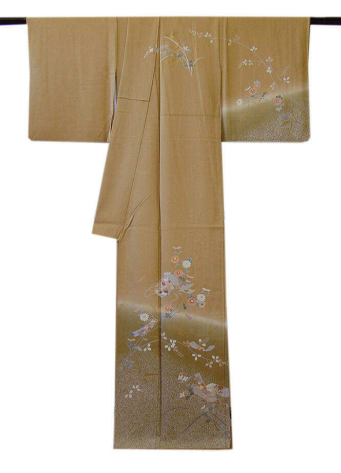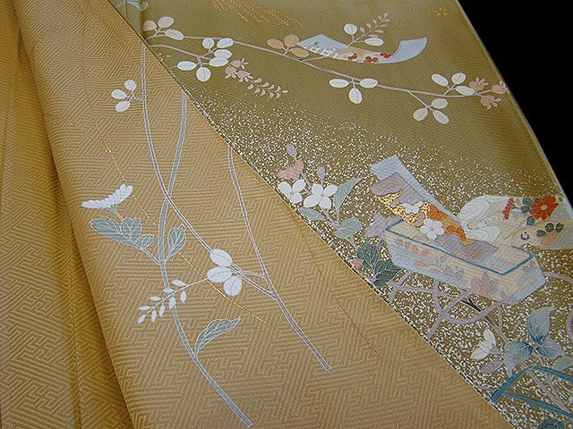 | 商品説明 | こちらのお品は「袷」ですので10月から5月までお召頂ければと思います。 大変にしなやかで柔らかな手触り良い滑らかな重めの紋意匠地の生地、 薄い黄橡色地に裾にかけて国防色ぼかし染に白色のたたき染に、 文箱に花木柄の本加工染に金彩加工仕立て、 共八掛(正絹)、幅広い年代の方にお召頂けます。 |