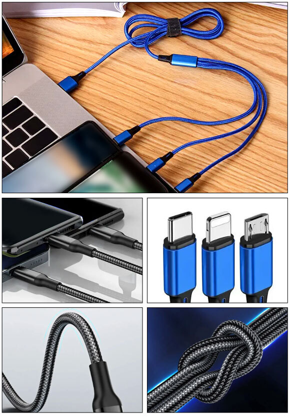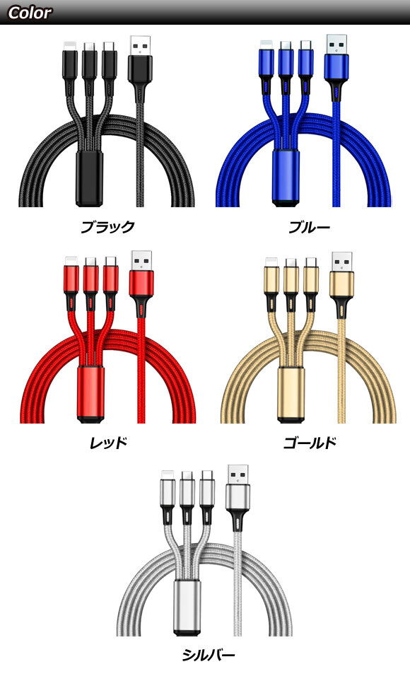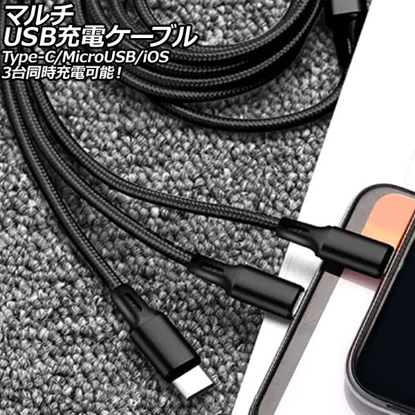 マルチUSB充電ケーブル ブラック 1.2m ナイロン編みタイプ 3台同時充電可能!Type-C/MicroUSB/iOS系端子がひとつに AP-UJ1014-BK