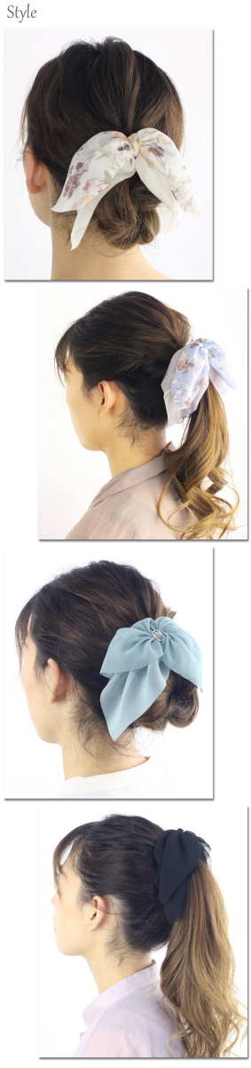 | 商品説明 | 立体感のあるダブルリボンでアレンジヘアに華やかさをプラス☆ 花柄は女性らしい印象に♪ 単色は大人ファッションにマッチします。 ポニーはもちろん、お団子ヘアにONすれば首元すっきり!!  |