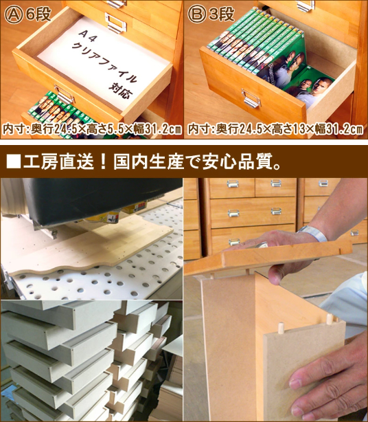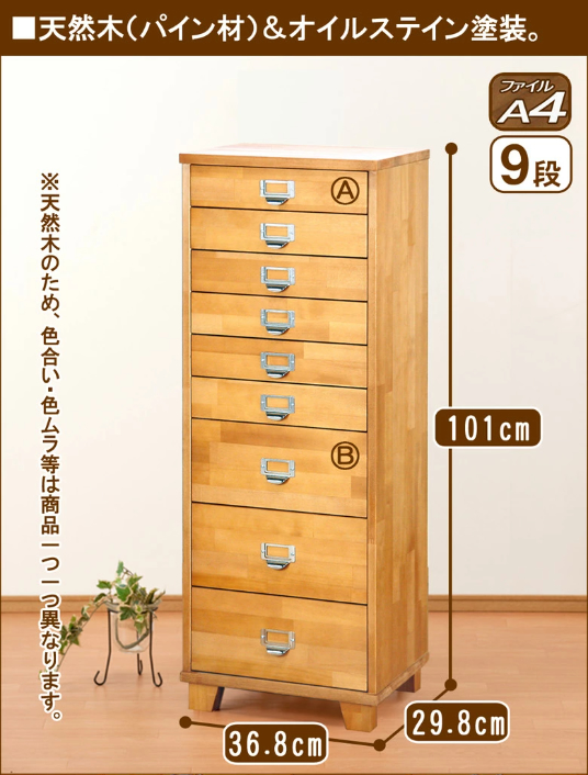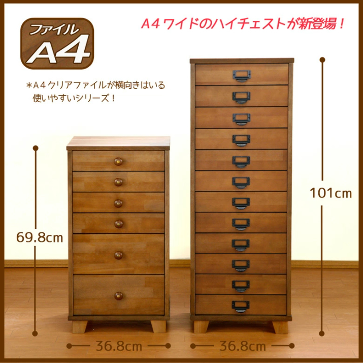 ※大手通販で天然木家具を多数掲載・販売している工房よりお届け♪※ 一番上の段だけカギ付きにできます!(画像7) 最上段カギ付きをご希望の方は必ずご希望のチェストと 同時に当方別出品のカギ付きオプションをご購入ください 当方出品中の小6段の商品の段数を増やしてほしいと要望があり 新しく作りました。 2番画像はイメージとして当方出品中の小6段と大12段の画像です。 実際の商品は1番画像の大9段商品になります。 仕分け収納の達人、カラー、取っ手、脚部の組み合わせを ご自由にお選びいただけます。 電化製品の説明書や家庭用分別ゴミ袋・雑誌やカタログ・ 書類や小物・薄手の衣類などもスッキリ片付きます。 プレートに名刺を入れておけば引き出しを開けなくても中身を確認できます。 引き出しはA4クリアファイルが入る大きさで、ネームプレートが便利 お好きなカラーで統一すれば貴女だけの素敵なお部屋にコーディネイトできます♪ 風合いの良い天然木でシックかつ高級感溢れる雰囲気。 お部屋の雰囲気パッとが華やぎます。 ■本体カラー ■カラー:ライトブラウン ■カラー:ダークブラウン ■カラー:シャビーホワイト(素材感を生かした濃さです) ■無塗装 *落札後■本体カラーをお選び下さい。 ■取っ手:ネームアンティーク ■取っ手:ネームブラック ■取っ手:ネームシルバー ■取っ手:ドームシルバー ■取っ手:ブロンズハンドル ■取っ手:ウッドダークブラウン ■取っ手:ウッドライトブラウン ■取っ手:ウッド薄いホワイト ■取っ手:ウッド無塗装 *落札後5番画像から取っ手をお選び下さい。 ■脚部:木脚タイプorキャスター *落札後6番画像から脚部をお選び下さい。 購入後、取引メッセージにて下記のように先に画像から選んで ご連絡して頂ければスムーズに制作にとりかかれ 早く発送できます。 ↓ (例) ■カラー:ライトブラウン ■取っ手:ネームシルバー ■脚部:木脚 ↑ ■商品の状態:新品・完成品(脚部は取り付け) ■サイズ:幅368×奥行298×高さ1020mm (脚部、取っ手含まず) *引き出し9段(有効内寸) *浅い方6段:幅312mm×奥行245mm×高さ55mm *深い方3段:幅312mm×奥行245mm×高さ130mm *引き出しにはA4クリアファイルごと入りとても便利です。 ホワイトの商品につきましてはデジタルカメラでの撮影により白飛びしております、 白飛びとは白一色に見える現象です、画像のように木目を塗りつぶすような 塗装はしておりません実物の色は画像よりも薄く木目が一番綺麗に見える最適な 塗装をしております。 ■備考:パイン材 オイルステイン塗装(アレルギーも安心塗装) *商品の材質・特性について詳しくはHPで御確認ください。 (大手通販)掲載商品 |