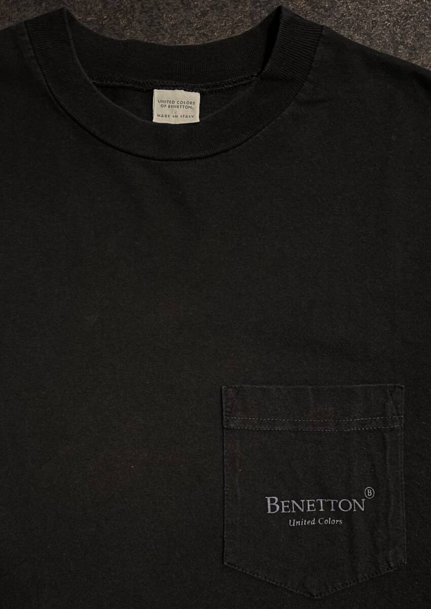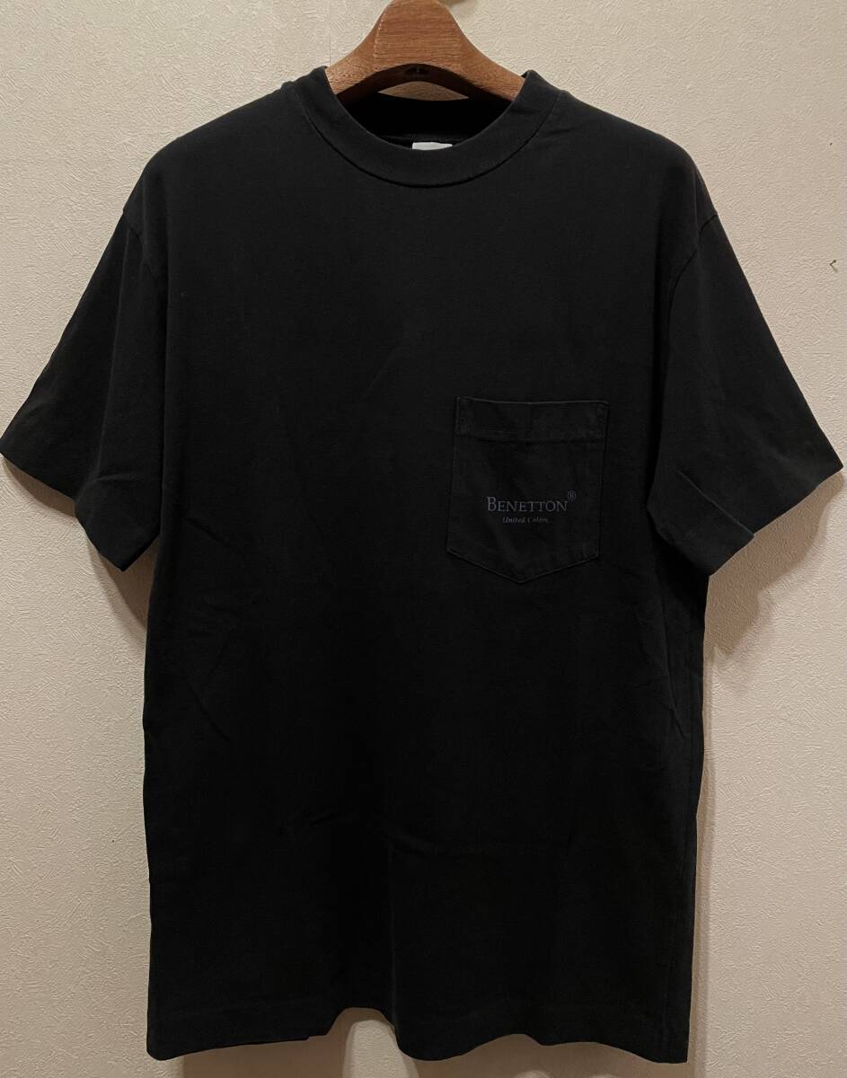 ITALY製90sオールドBENNETTONポケットTシャツM~ビッグシルエットSコットン袖裾シングル黒ブラック90年代ベネトン希少ロゴ胸ポケTビンテージ