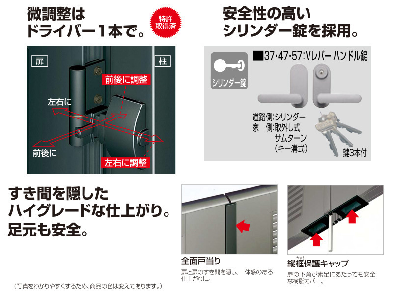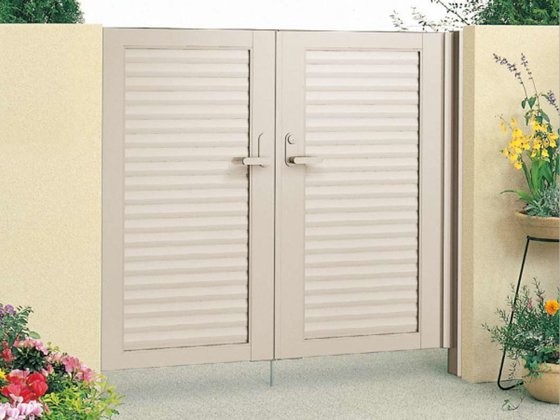 仕様 | 扉仕様:両開き 外開き 設置方法:門柱タイプ レバー錠:道路側:シリンダー/家側:取外し式サムターン(キー溝式) ※家側はサムターンを取り外すことで、キー溝式に変更できます。 |