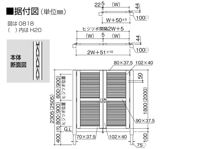 サイズ | 扉サイズ:幅1000+1000mm×高さ2000mm 柱サイズ:扉の高さ1000/1200=75角柱 扉の高さ1400/1600/1800/2000=100角柱 |