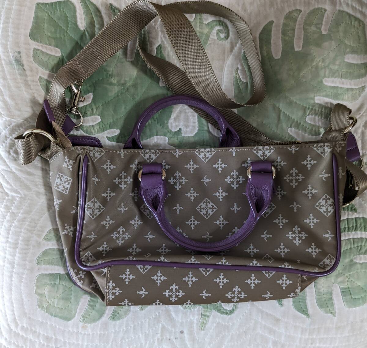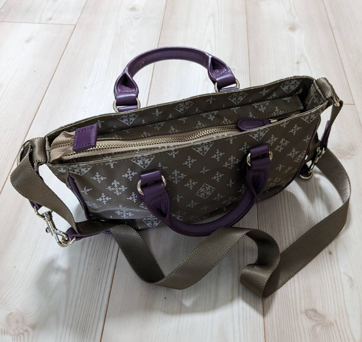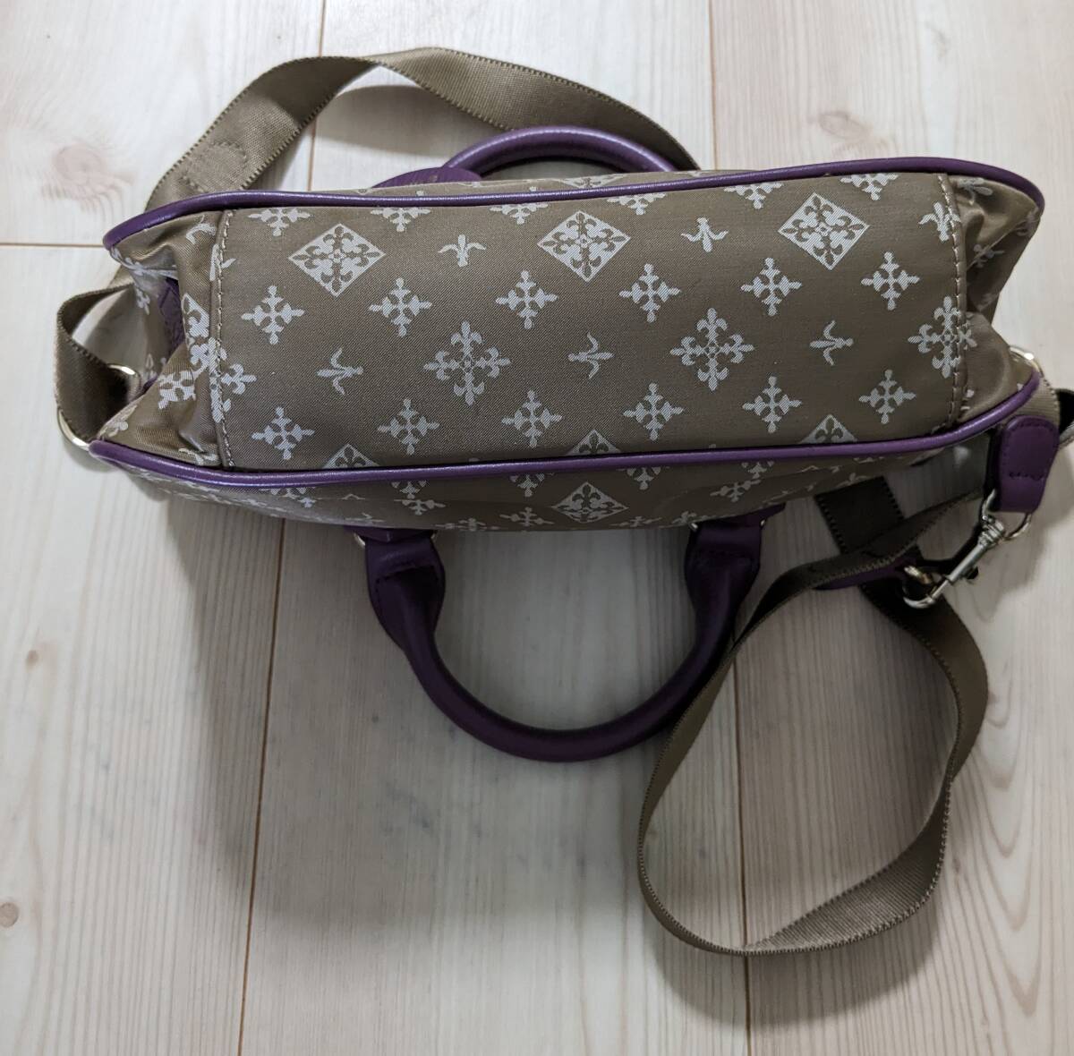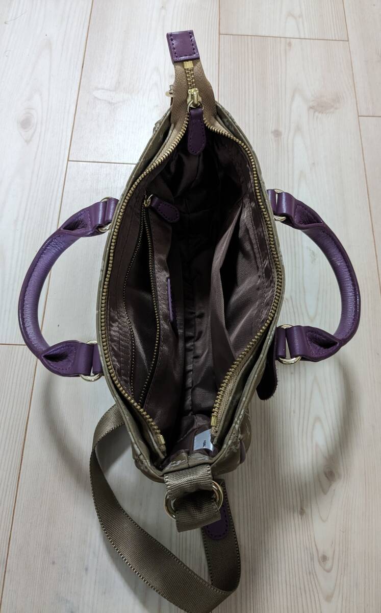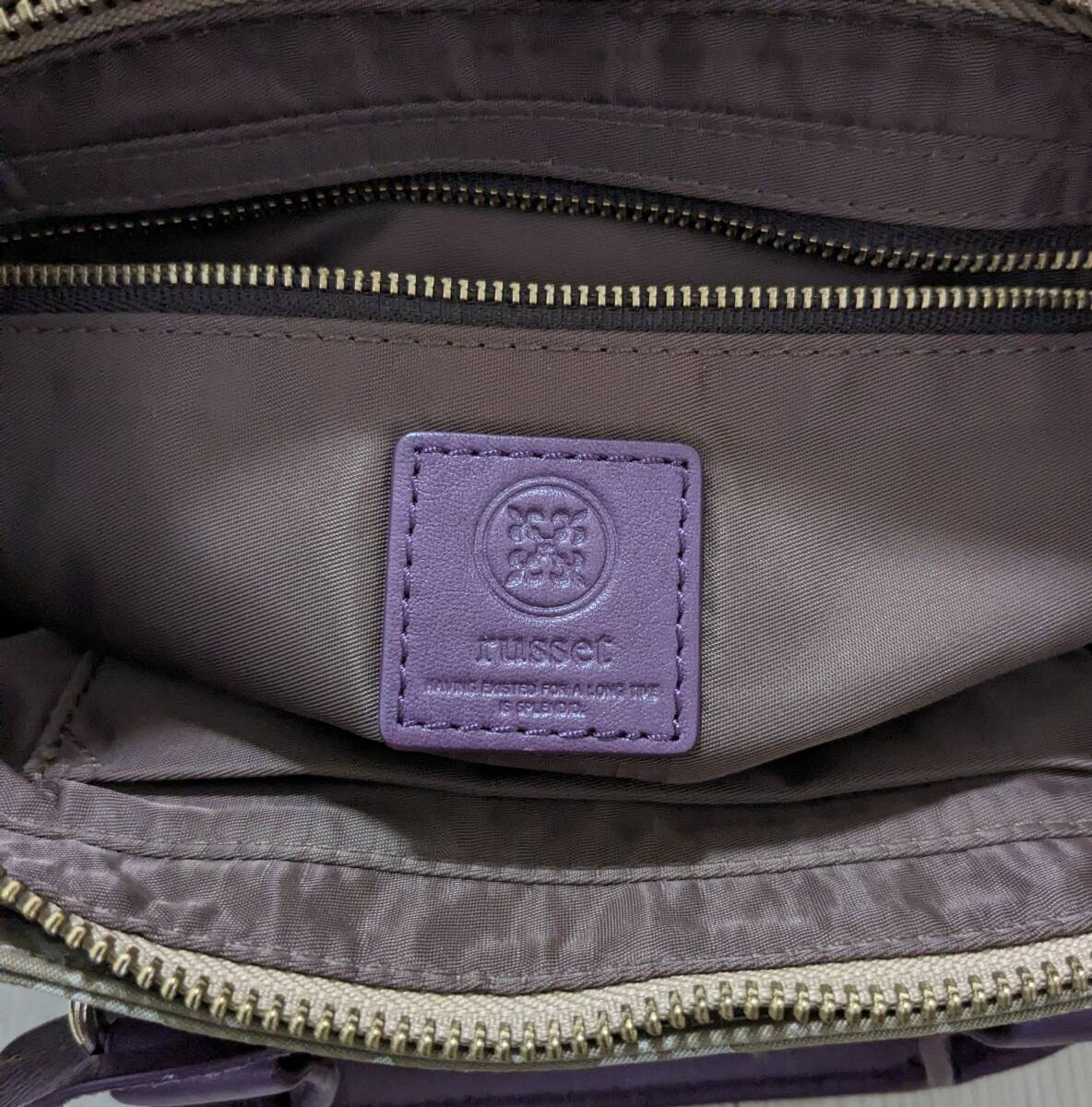 russetのナイロンショルダー、本体サイズ26137cm。ナイロンショルダー自体にシミ・汚れ・破れ・色褪せは見当たりません。また、ショルダーベルト120cm、金具にもサビや剥げは有りません。紫色革の取手やトリミングにヒビ・擦れ・色褪せは皆無です。ファスナー開閉問題無し、インナーには2箇所小物入れが有り汚れやシミも有りません。ただ、当方の主観的判断なので細かな所までは分かりませんことをご理解下さい。オリジナル袋は有りません。