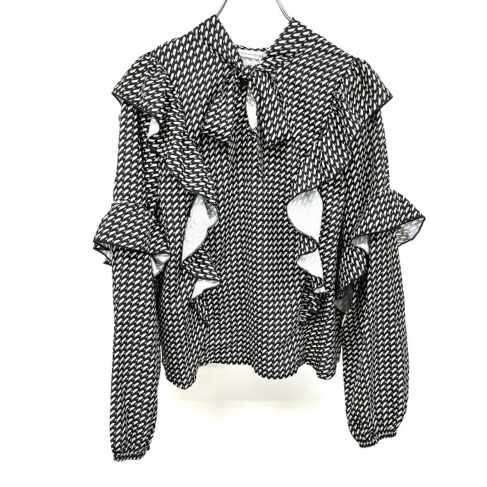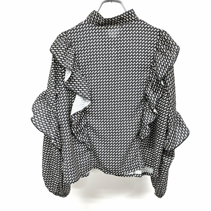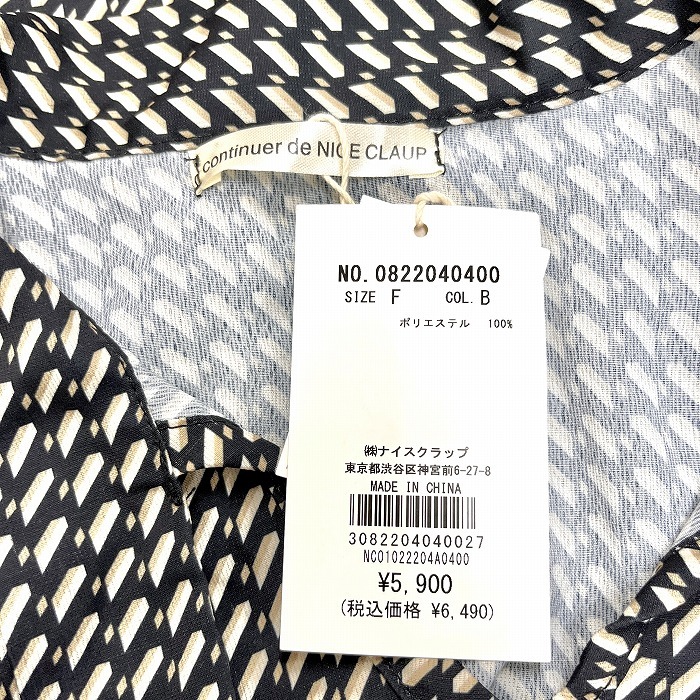| 商品タイトル | 【新品】NICE CLAUP - F レディース ラッフルショルダー プルオーバートップス リボンネック 幾何学柄 長袖 ポリ100% 黒×茶系×白系 黒系 |