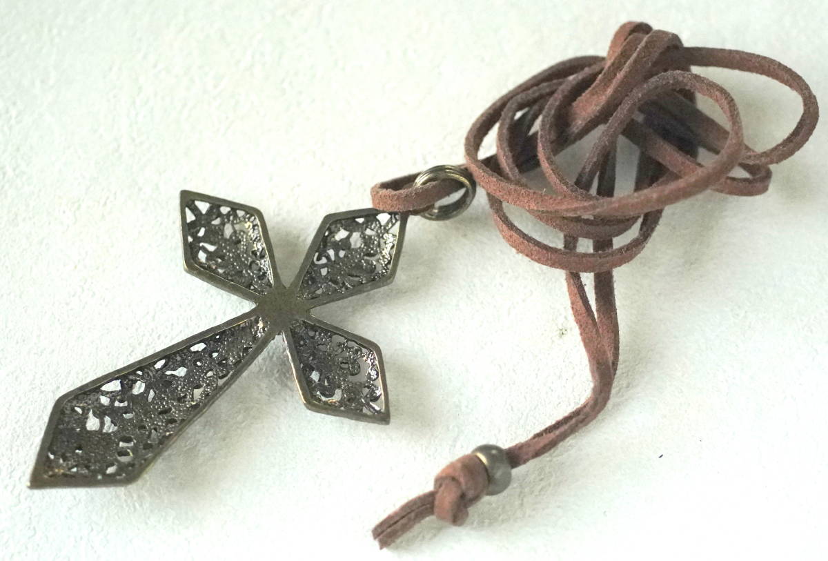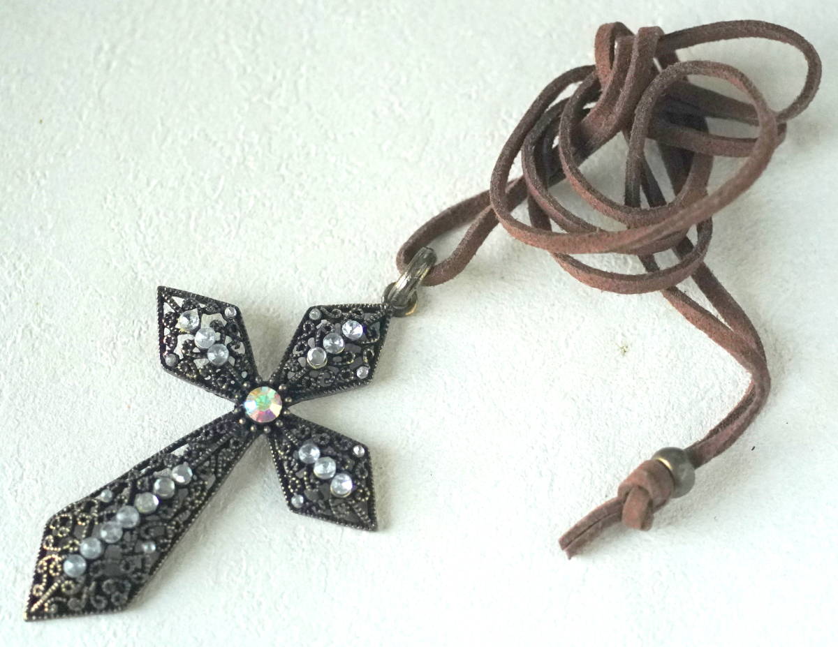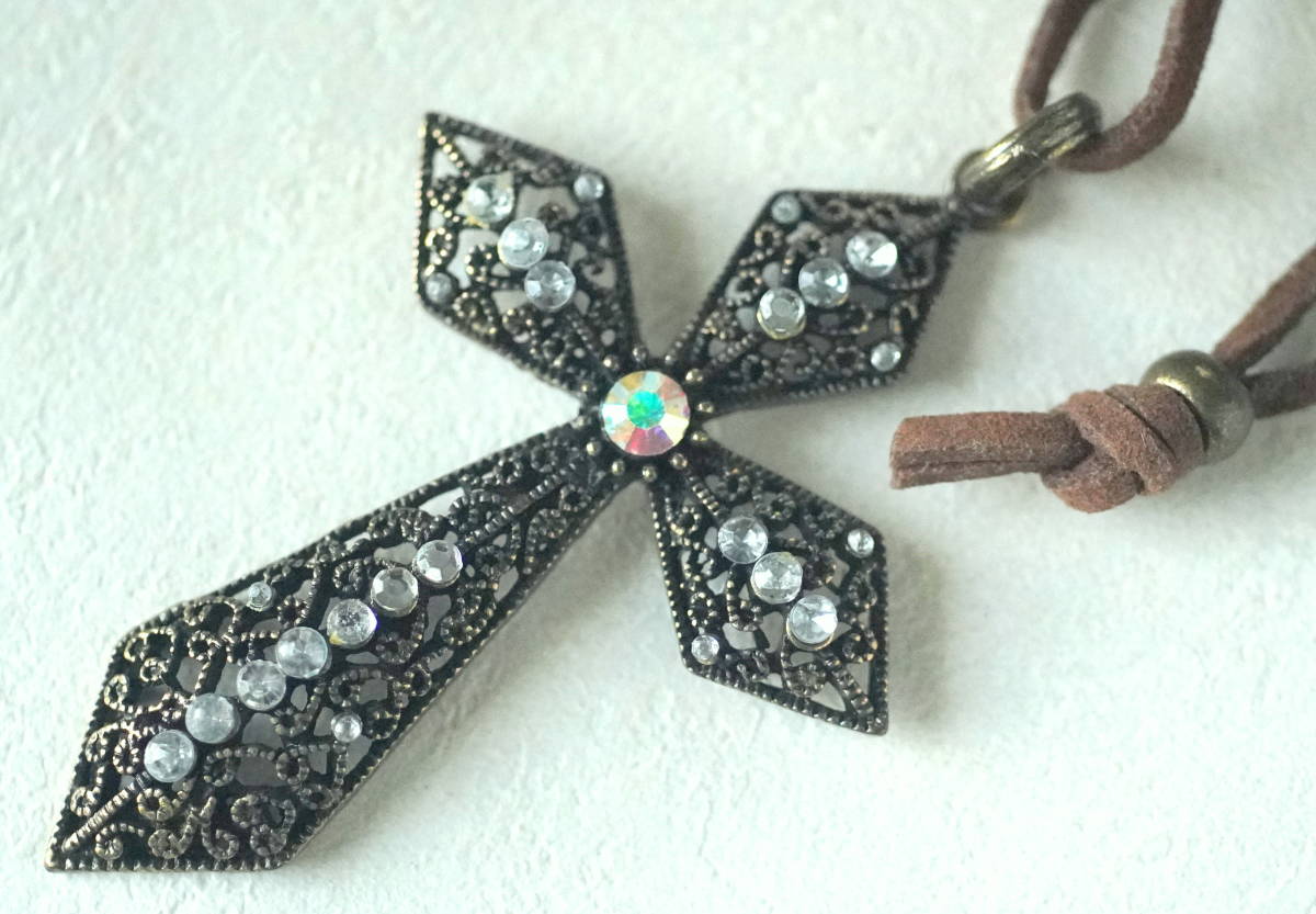 アンティーク調 大きめ 十字架 ネックレス ペンダント 金古美カラー ラインストーン付き