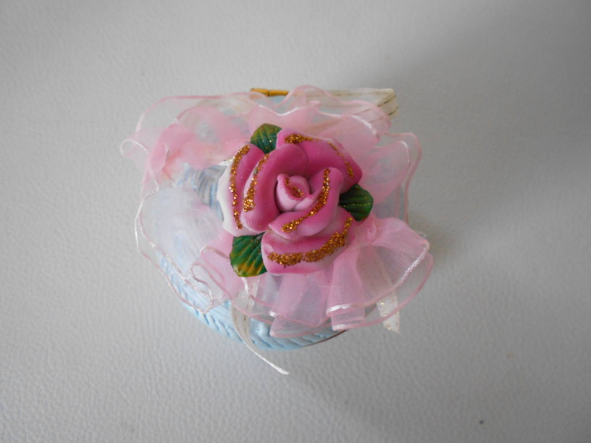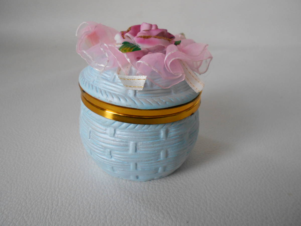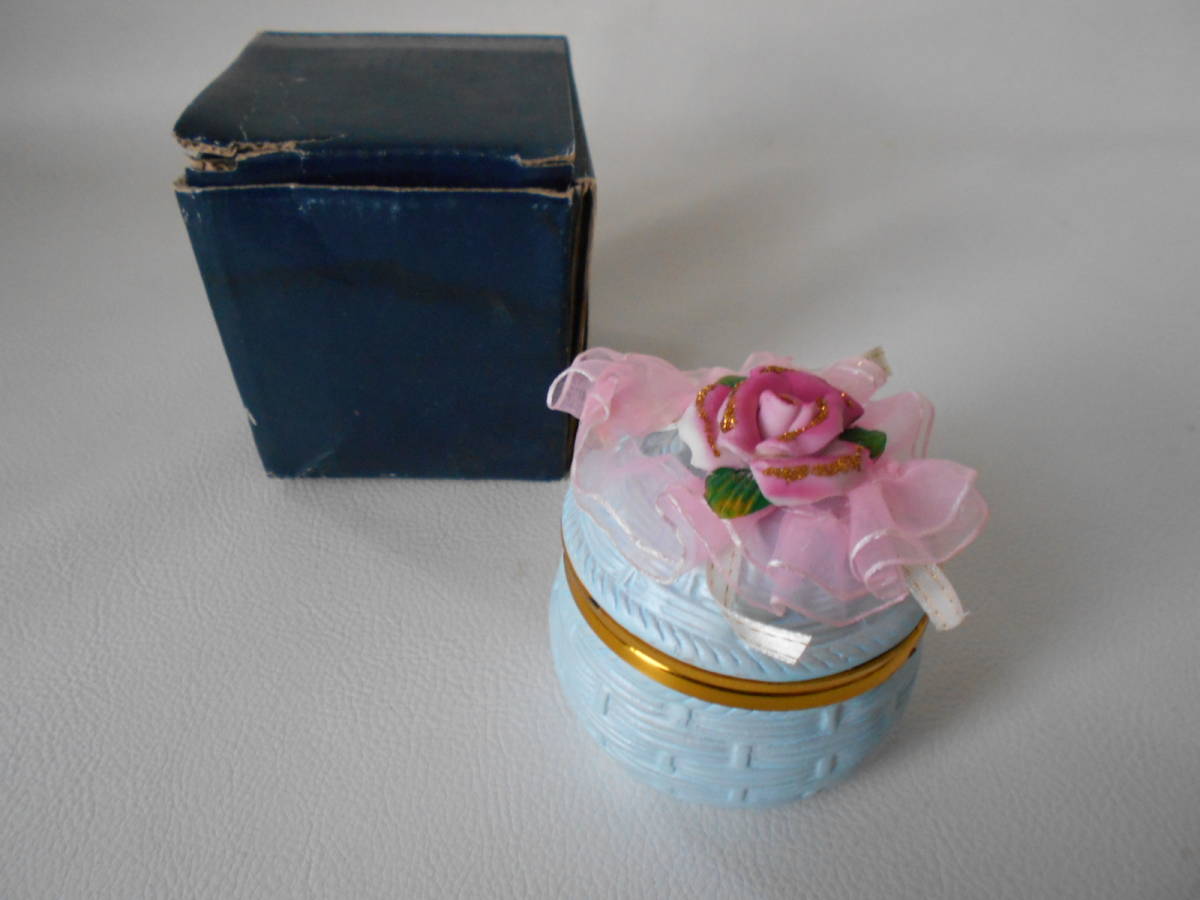 昭和レトロポップ 陶器製 小物入れ キャンディーポット 水色 バラとリボンの飾り付き 未使用自宅保管品