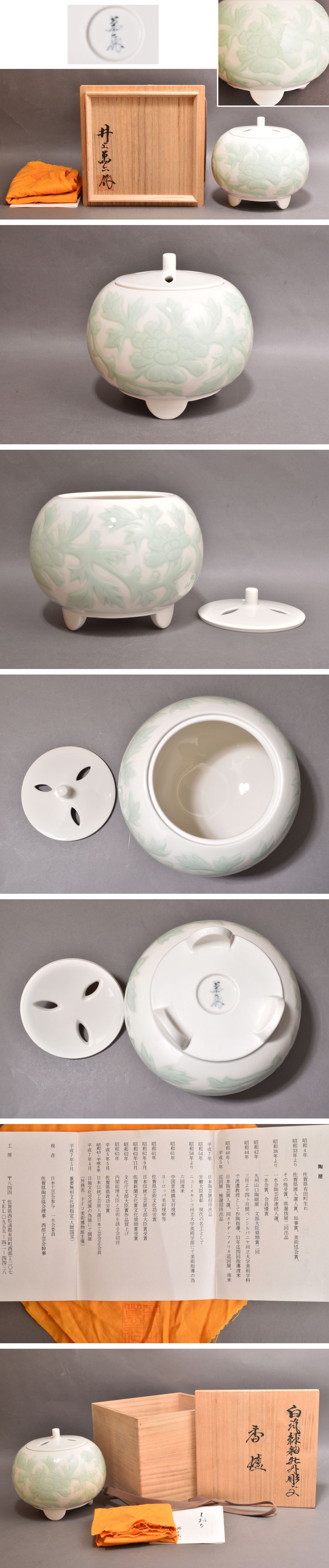 4375 井上萬二 白磁緑釉牡丹彫文 香炉 人間国宝 無キズ 共箱