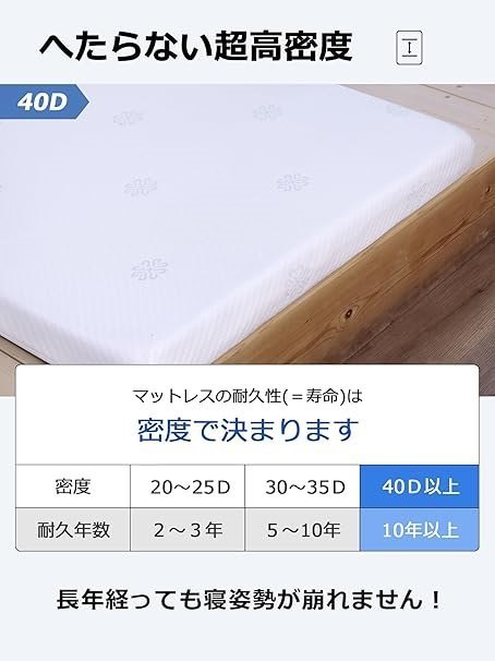 40Dというウレタン密度を使っているベッドマットで、約10年前後の耐久性を期待できます。