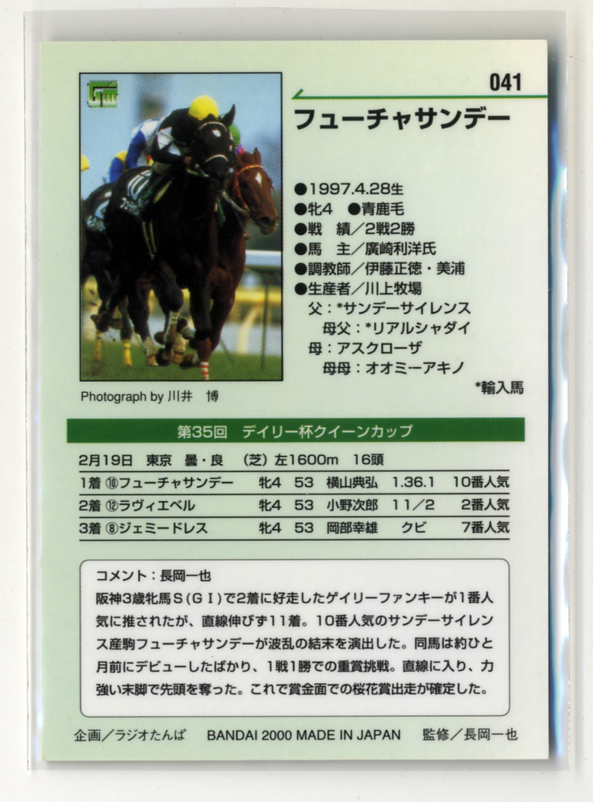 | ★サラブレッドカード2000年上半期版 パラレル 箔押し金文字サイン 041 フューチャサンデー 第35回デイリー杯クイーンカップ 横山典弘 写真 画像 競馬カード 即決 | |