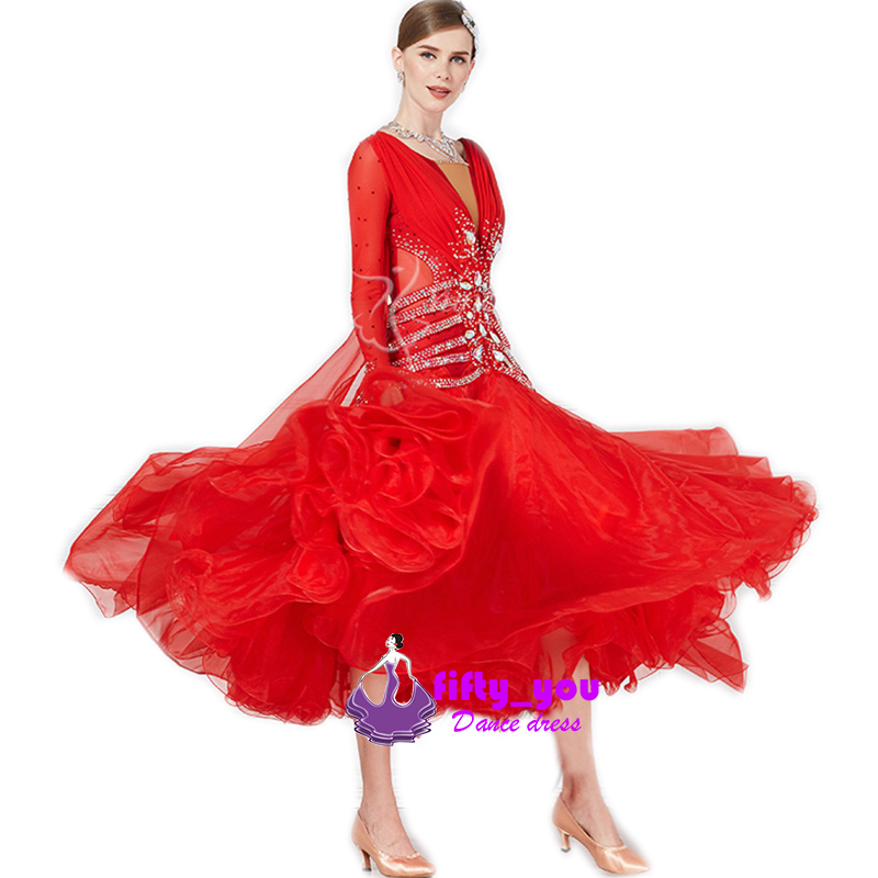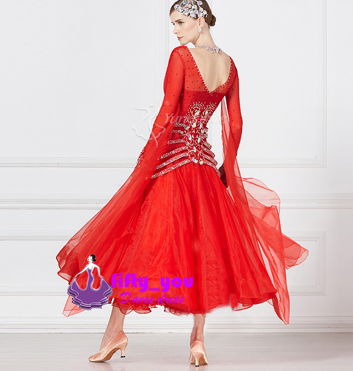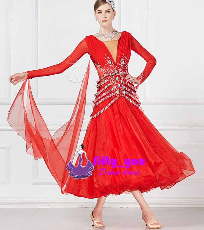 新品fifty_you セミオーダードレス 社交ダンスサイズオーダー競技発表用ダンスドレス レディースモデル着用 ゴージャス石飾り レッド