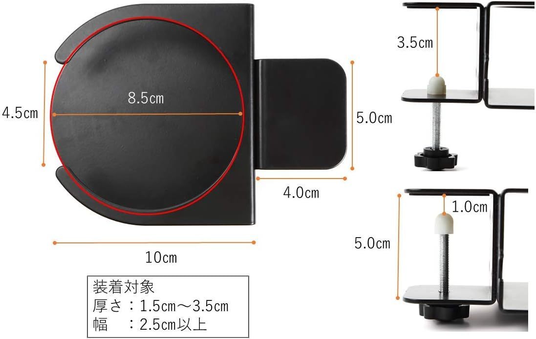 装着面の幅が2.5㎝以上、 厚さが1.5~3.5cmの机や椅子、棚などを対象に装着可能です。