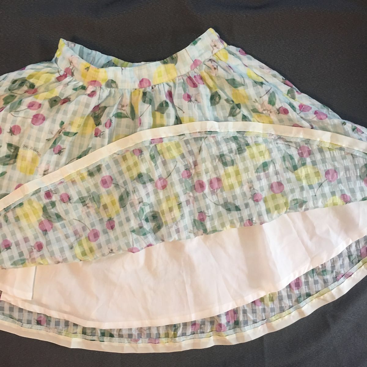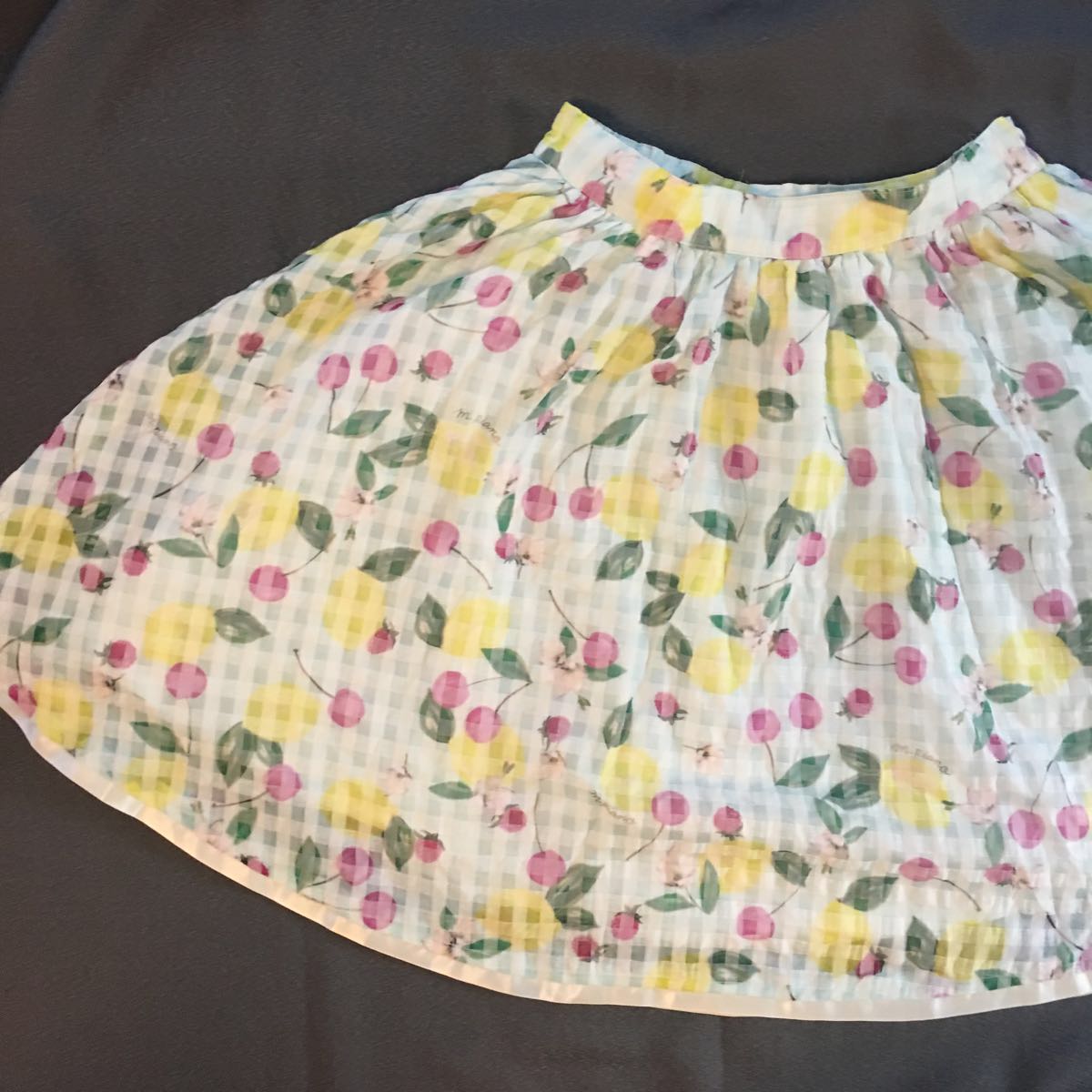 レトロ雰囲気で可愛らしいフルーツプリントスカート★ これからのシーズンに大活躍する一枚★ 表地はふんわりとした軽やかな素材感、裏地が付いているので、すけることもありません★