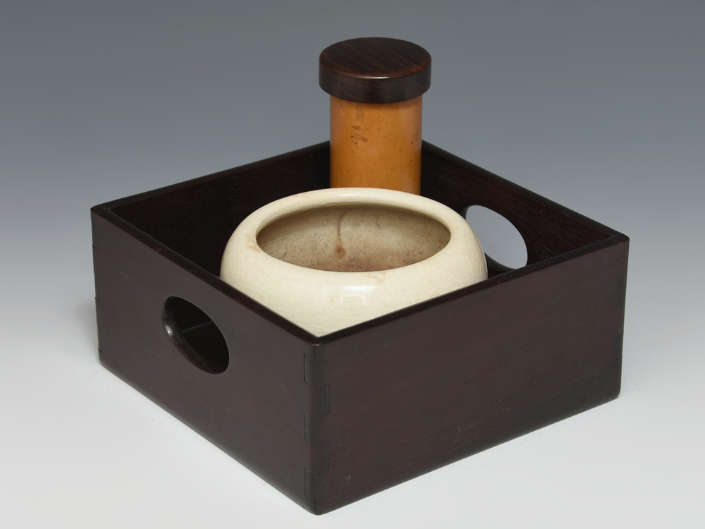 紫檀の煙草盆です。 火入と竹製の灰吹きが付属しています。 大切に使われてきたであろう味わいのあるお品物です。 灰吹きの底部に穴があいていますが、その他の状態は概ね良好です。 ※撮影の際に生じた写り込みなどがございます。 ご理解の程よろしくお願い致します。 |