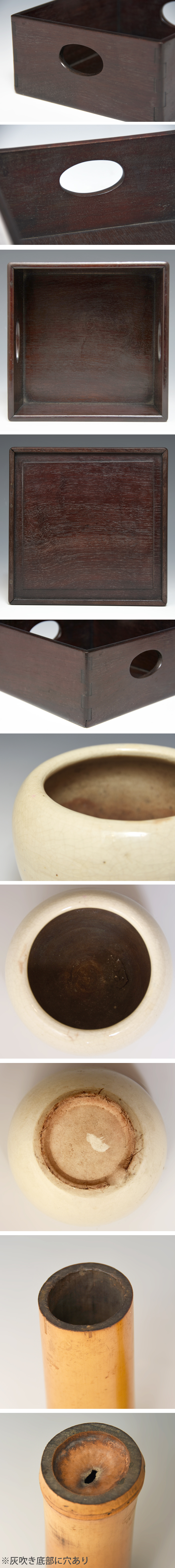 [煙草盆] 縦横:17.2㎝ × 17.2㎝ 高さ:8.0㎝ [火入] 口径:8.2㎝ 胴径:11.6㎝ 高さ:8.2㎝ [灰吹き] 径 :4.3㎝ 高さ:12.5㎝ (蓋含まず) |