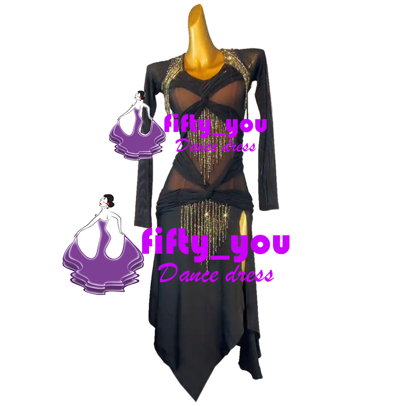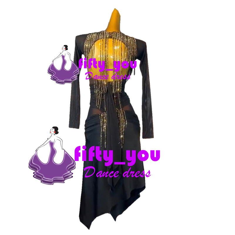 新品fifty_you オリジナル格好良い新作 レディース社交ダンスドレス サイズオーダー ラテン競技試合パーティードレス ストーン飾り 黒