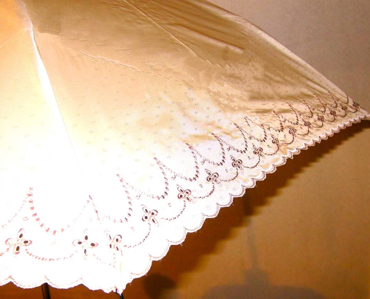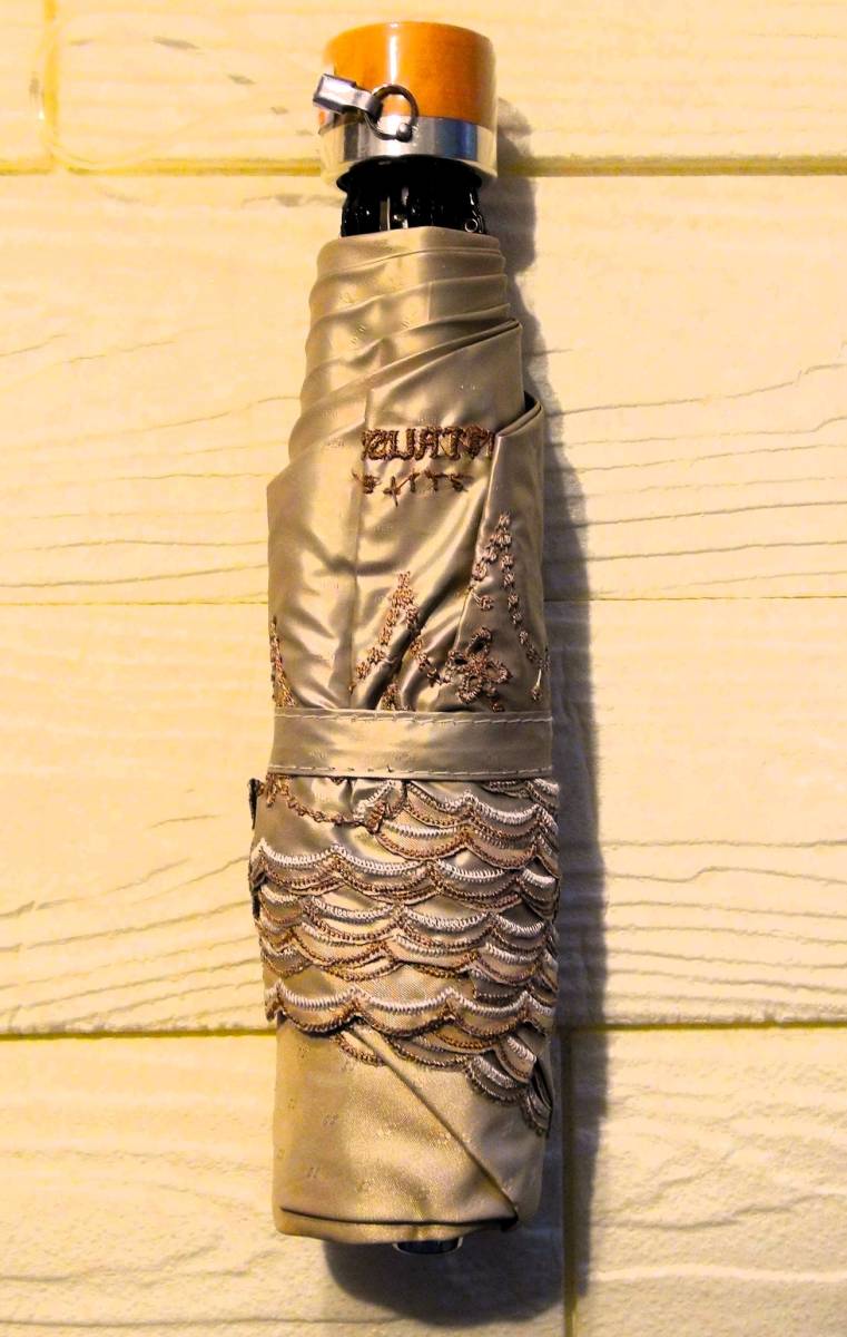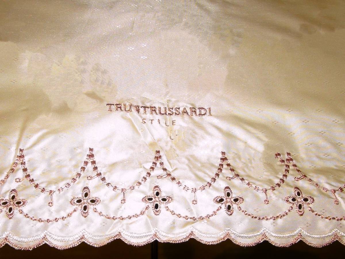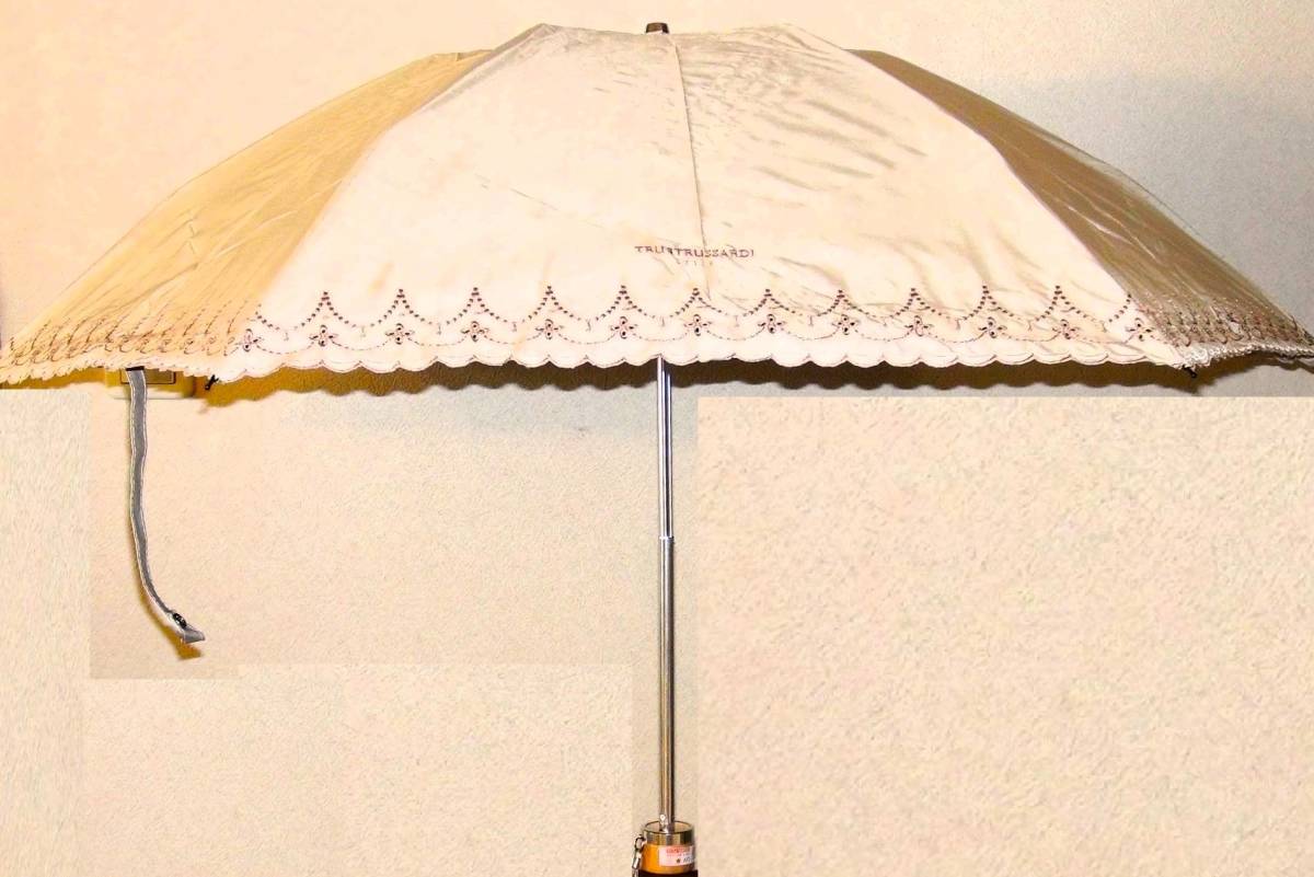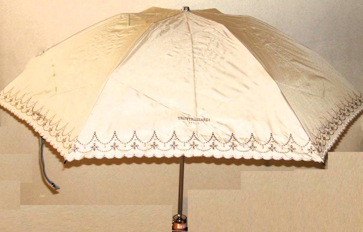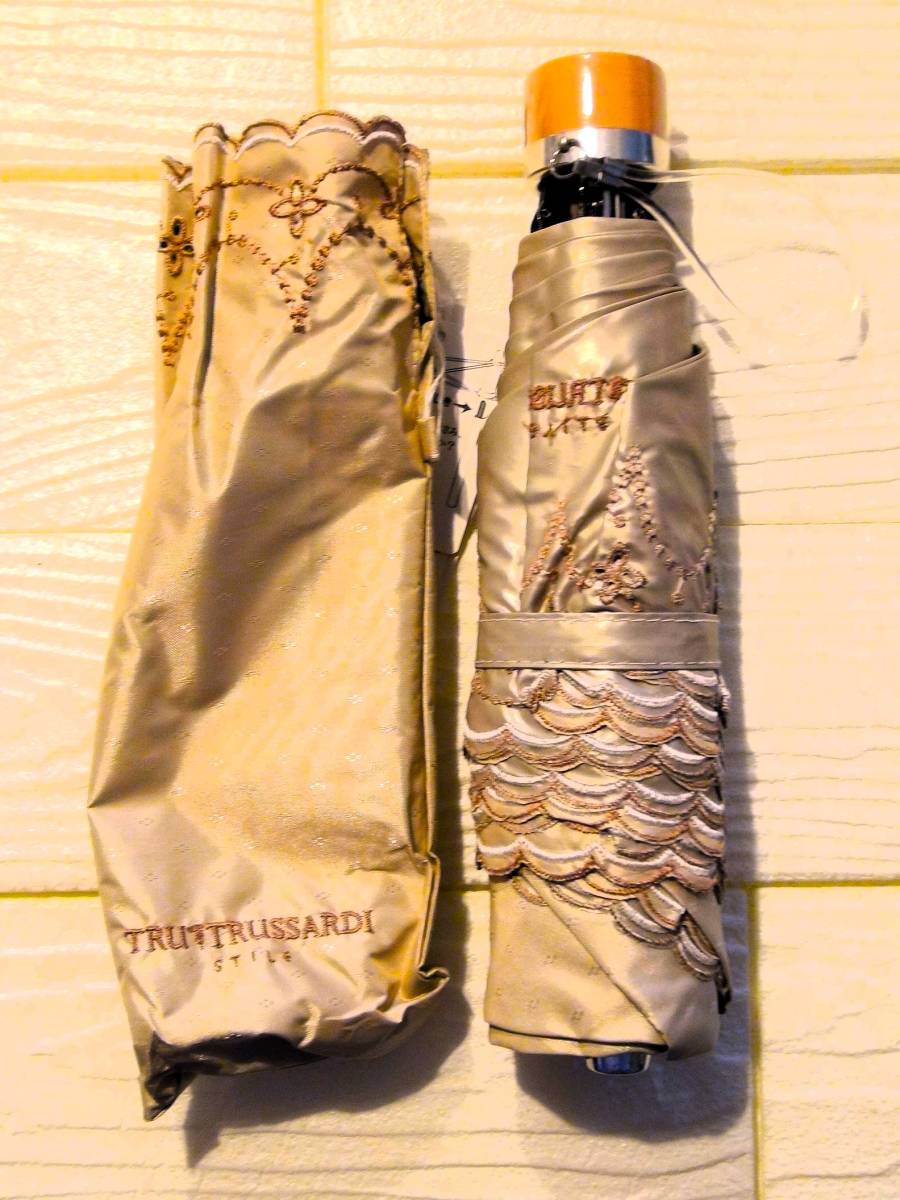 (レディース・晴雨兼用傘・新品)折畳み傘 TRUSSARDI トラサルディ オーロラ㈱ ベージュ地模様 縁レーススカラップ風 骨長50㎝ 重さ230g