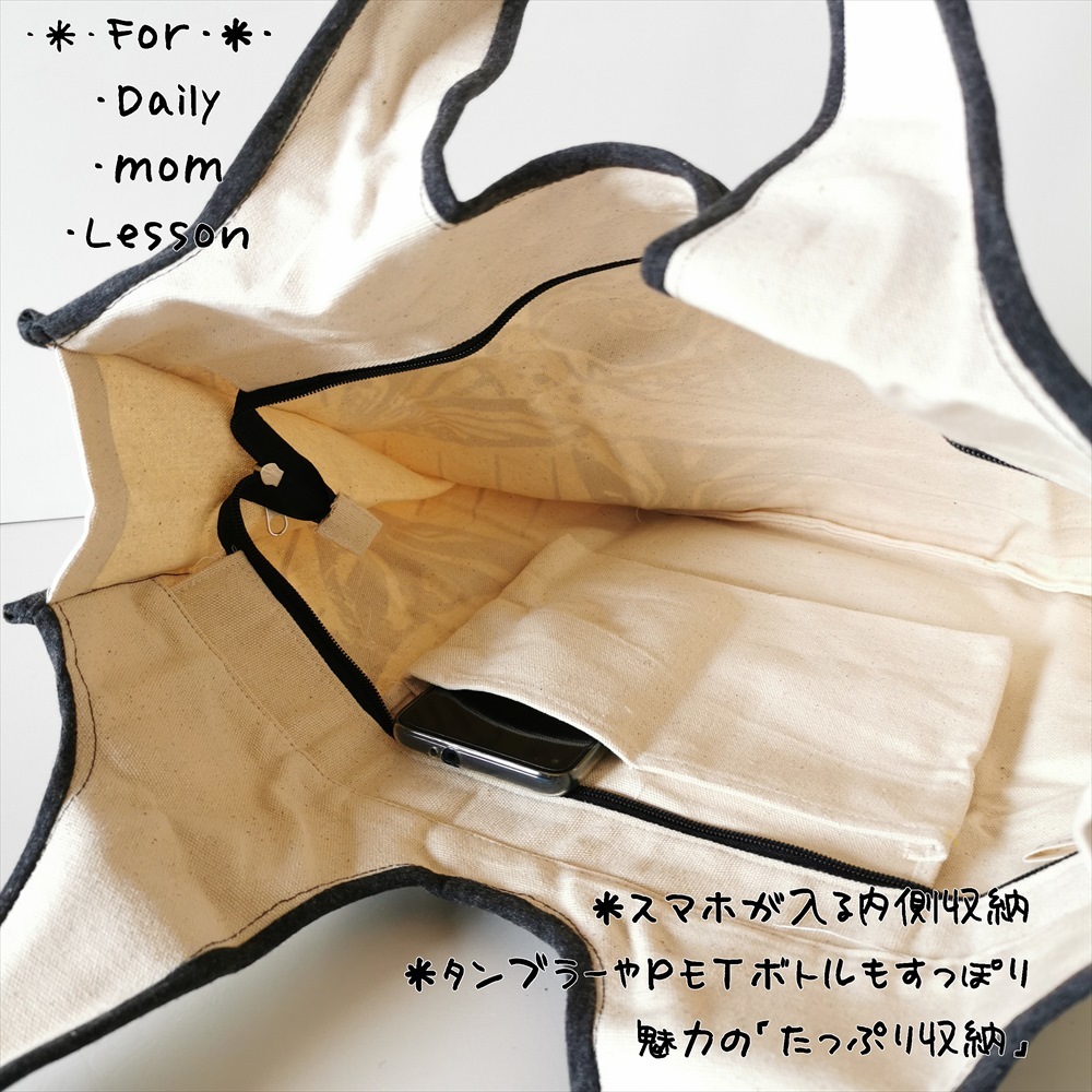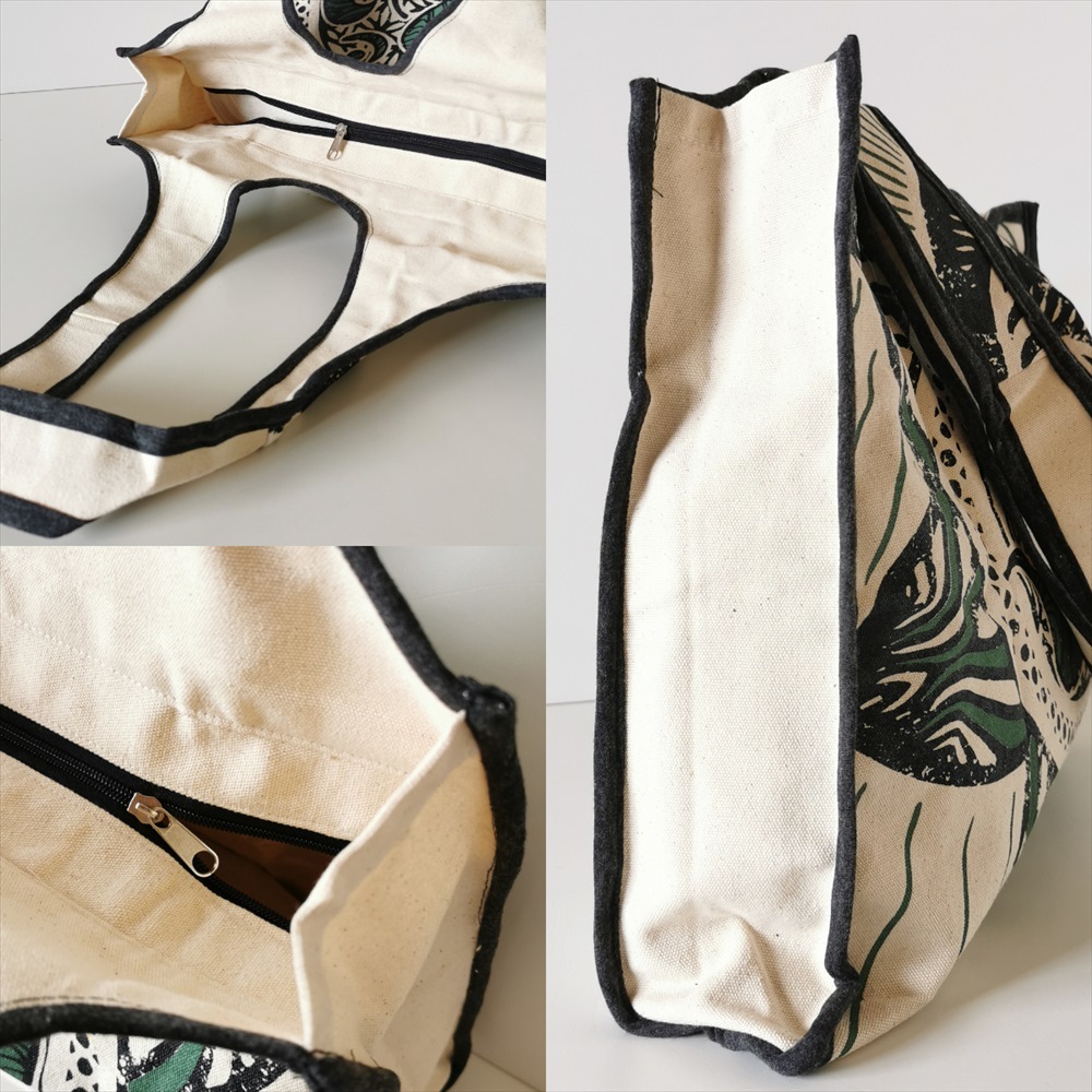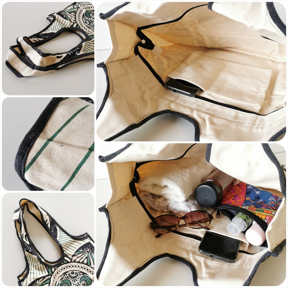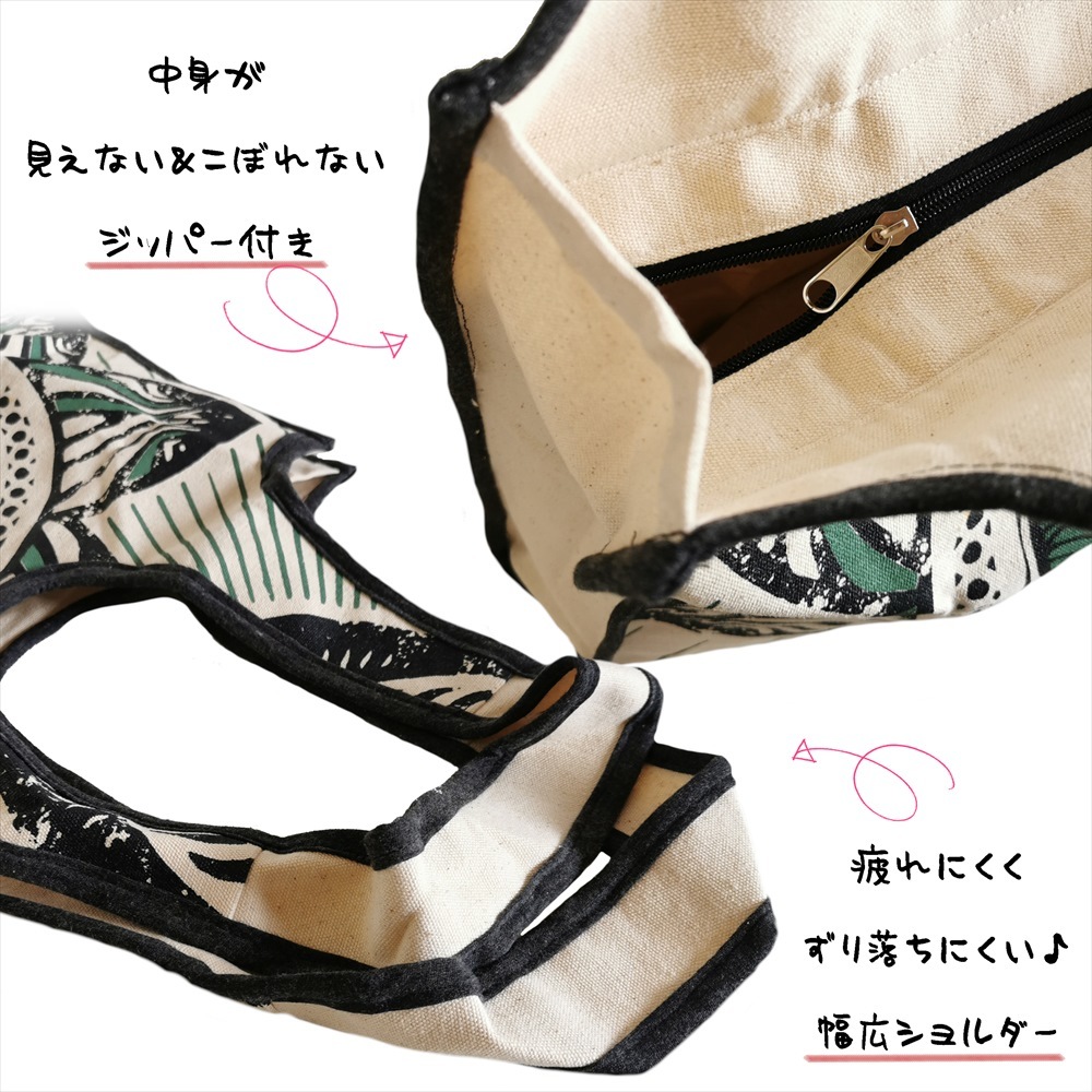 おしゃれなエスニック柄をプリントした個性派トートバッグです。とっても丈夫で軽い、カジュアルなキャンバス素材を使用したショルダータイプ。普段使いからお稽古Bag・ママBagなどマルチに使えるサイズ感です。内側にはチャックがついているので、中身が見えたりこぼれ落ちる心配もありません◎A4サイズのファイルなどがスムーズに出し入れできるサイズ感、さらにスマホすっぽりサイズのポケット収納二か所付き?ショルダー部分は平らで疲れにくく、コットン素材だから滑りにくいのも嬉しいポイントです♪