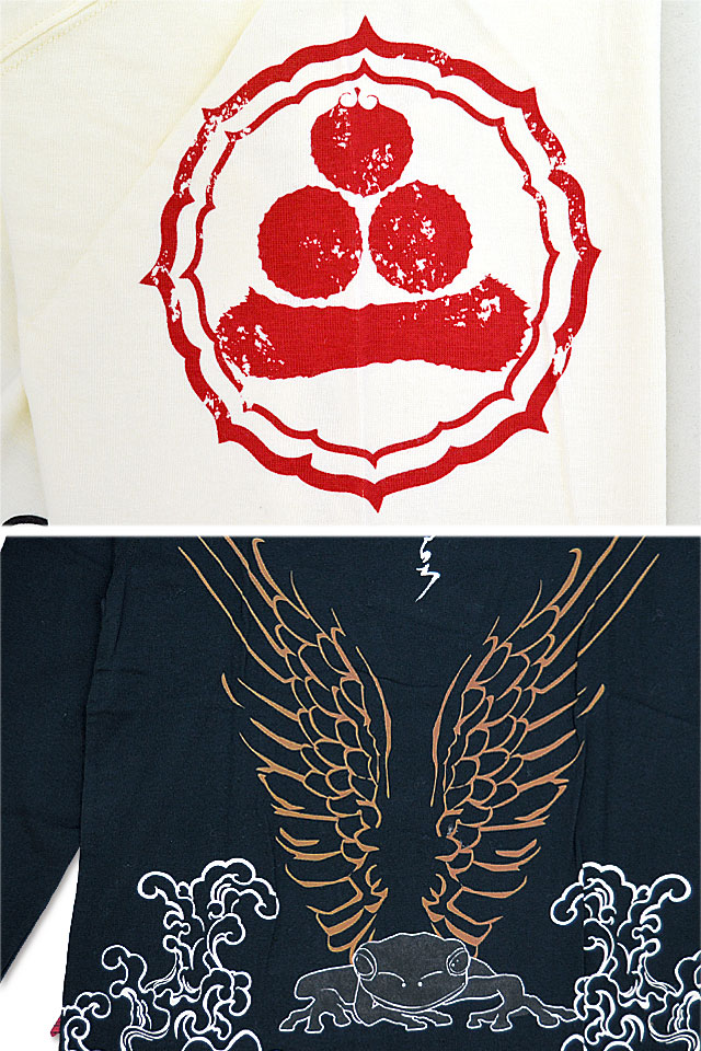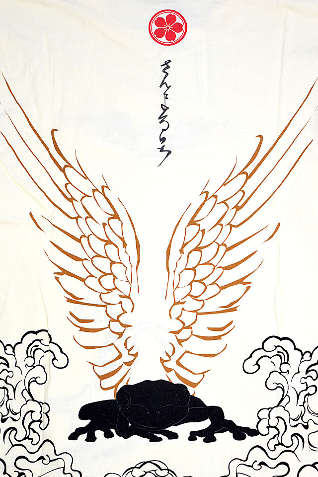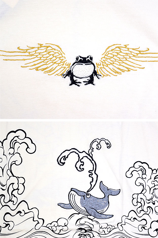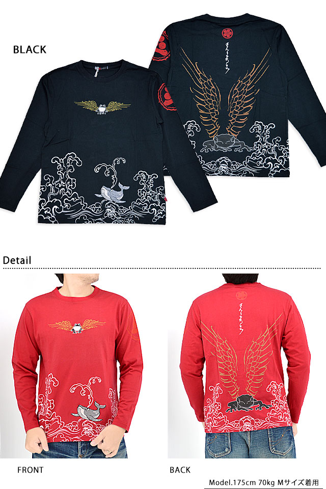「参丸一」さんから「羽根蛙ロングTシャツ(SLT-50062)」のご紹介です。 羽根を生やした蛙を背中に落とし込んだ、インパクト抜群の長袖Tシャツです。 フロント中央にも同じく羽根蛙を刺繍。 裾はぐるりと囲むように波がプリントされており、鯨が泳いでいる姿が描かれています。 右袖には家紋をワンポイントでデザインしました。 ボディーには、綿100%のものを採用。 柔らかな肌触りでありながらも刺繍に負けないコシのあるTシャツ生地です。 | |||||||||||||||||||||||||