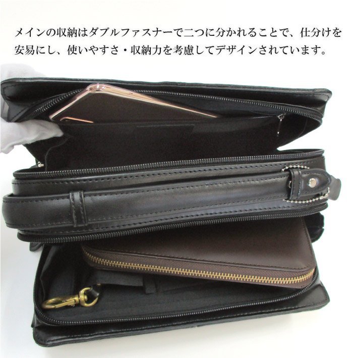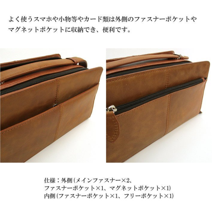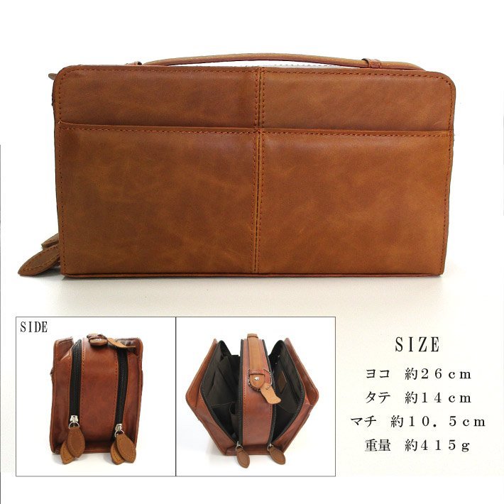 | よく使うスマホや小物等やカード類は外側のファスナーポケットやマグネットポケットに収納でき便利。 メイン収納はダブルファスナーで二つに分けることで仕分けを安易にし、使いやすさ・収納力を考慮してデザインされています。 本商品は天然素材の本革・染料を使用しています。 手触りよく、上質で柔らかい質感です。 誕生日プレゼント・クリスマス・バレンタイン・父の日・母の日などの贈り物にも最適です。 ■カラー:BLACK/CAMELよりお選び下さい。 (落札時、オーダーフォームにてご希望のカラーをご連絡下さいませ。ご連絡がない場合は、当店でカラーを選択させて頂きます。) ■素材:外側/本革 内側/綿 ■サイズ(約):横26cm×縦14cm×マチ10.5cm ■重量:約415g ■仕様:外側(メインファスナー×2、ファスナーポケット×1、マグネットポケット×1)/内側(ファスナーポケット×1、フリーポケット×2) ※ご注意※ ・革は自然が造り出した理想的な繊維です。 自然由来の素材のため革には細かなシワや傷跡・トラ等が存在する場合があります。 これらは本革である証拠であり、革本来の特長であり、魅力でもあります。 ・新品ではございますが製造上の過程により商品によっては細かな傷やへこみ、剥げ等がある場合が御座います。 また、多少の縫製のゆがみ・ノリの付着がある場合がございます。 ・ご覧のモニターやプラウザの設定、照明等により、画像と実物の色合いが、若干異なる場合がございます。 予めご理解とご了承の上、ご購入をお願いいたします。 | |