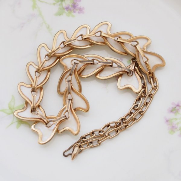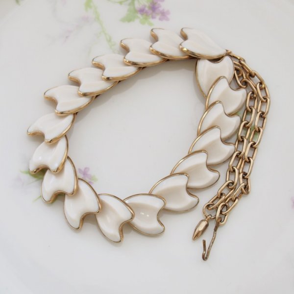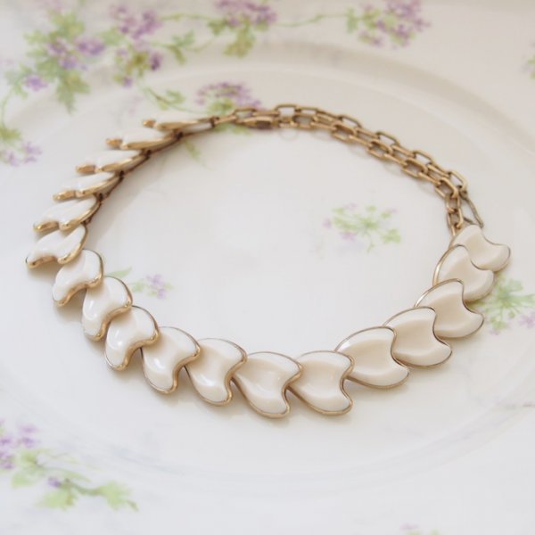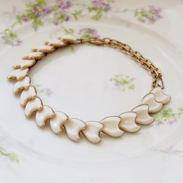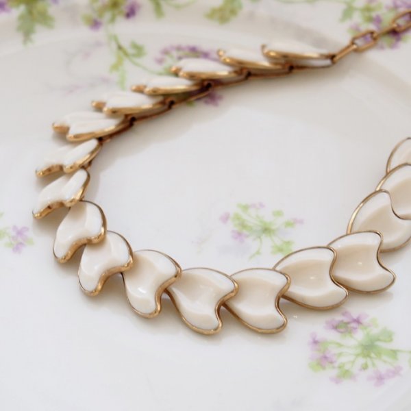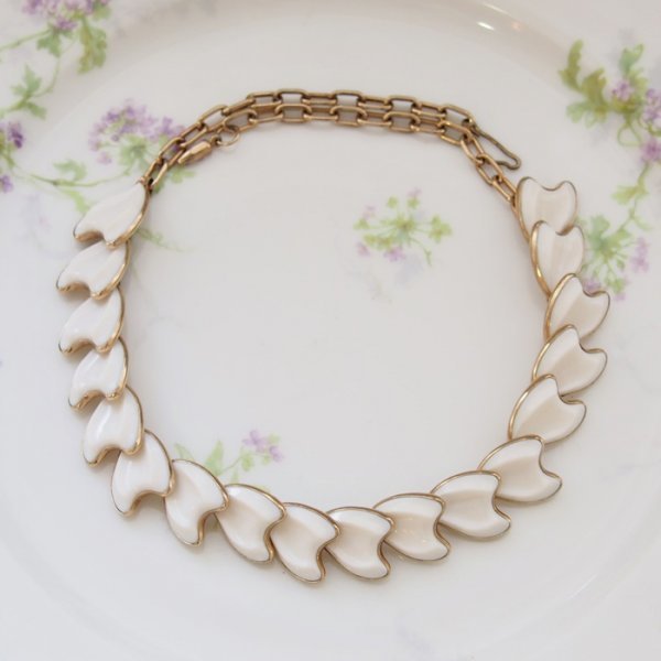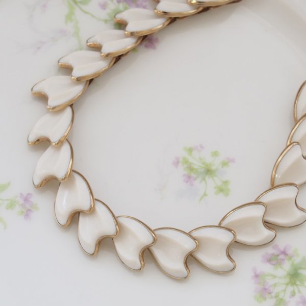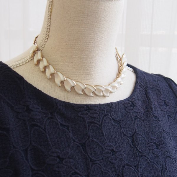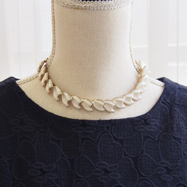 白い花びらのようなパーツが並ぶネックレスです。 花びら部分はプラスティック素材で軽めの着け心地です。 経年の為、金属部分に小キズ、スレやくすみが見られます。 フックの部分に歪みが見られます。 ■ブランド: Unsigned Beauty ■刻印: なし ■サイズ: 長さ約41cm 幅約1.5cm ■重量: 約23g アンティーク・ヴィンテージ商品には、経年による傷や劣化などがあります。 目立つものはアイテムの詳細に記載しておりますが、説明以外にもキズや損傷などがある場合がございます。 古いものですので、ご理解いただける方のみご入札下さいませ。 他サイトでも販売しておりますので、同時にご注文があった場合は、品切れの場合もあります。その場合は、大変申し訳ございませんが、ご注文をキャンセルとさせて頂きます事をご了承くださいます様お願いいたします。 | |||