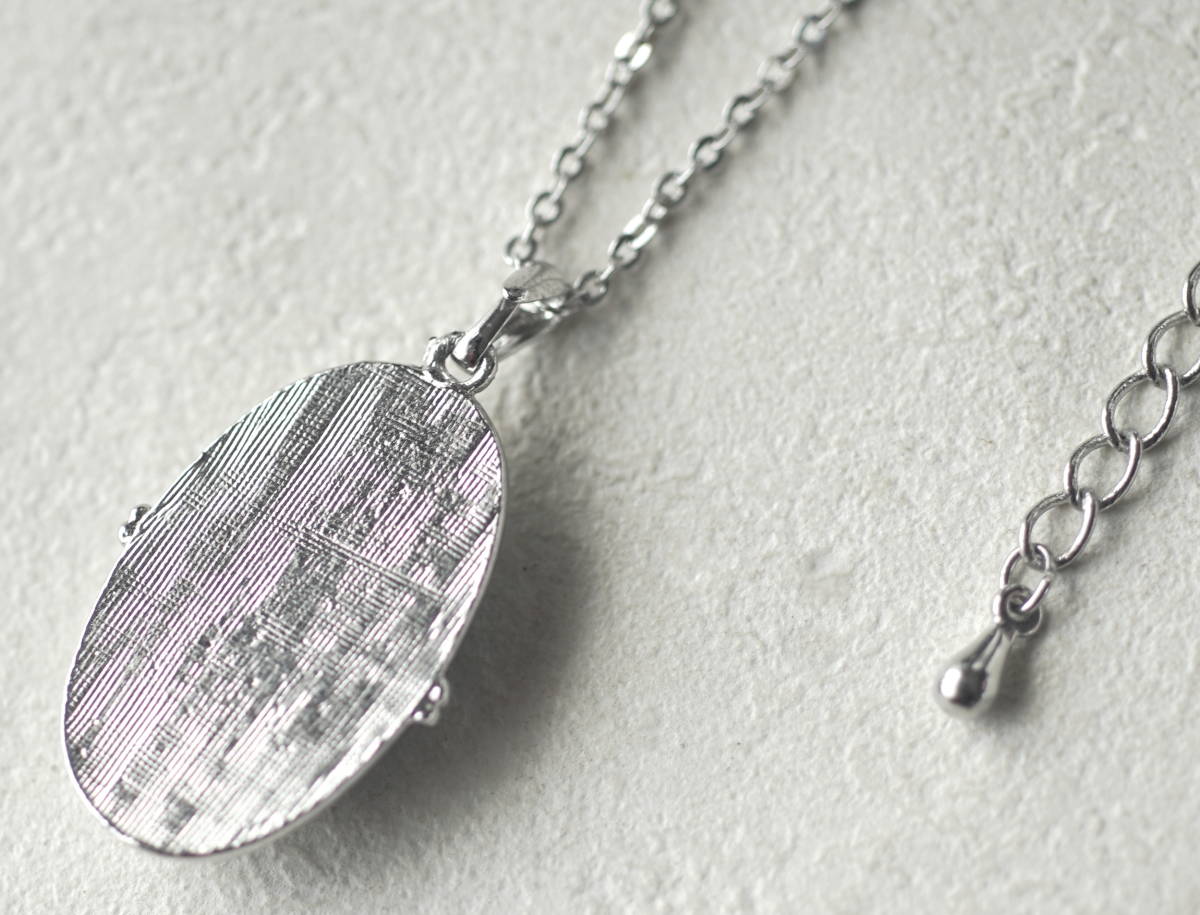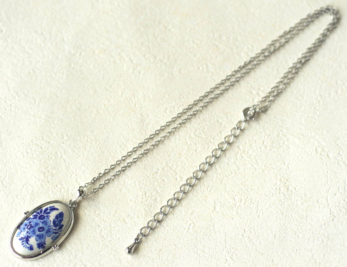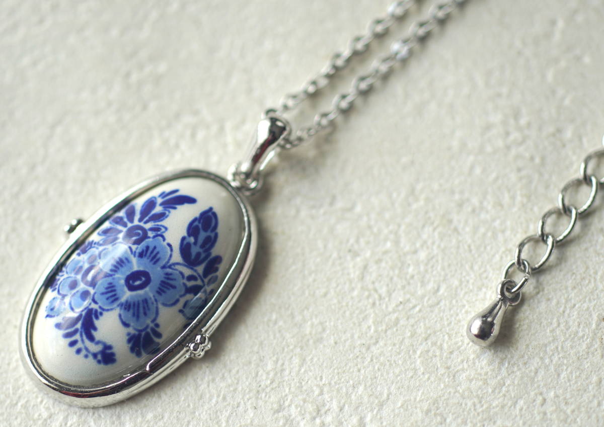 レトロ アンティーク風 デルフト陶器 青い花模様 楕円形カボション ネックレス ヴィンテージ オランダ