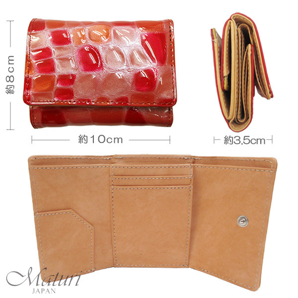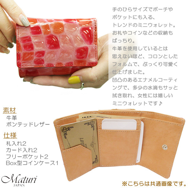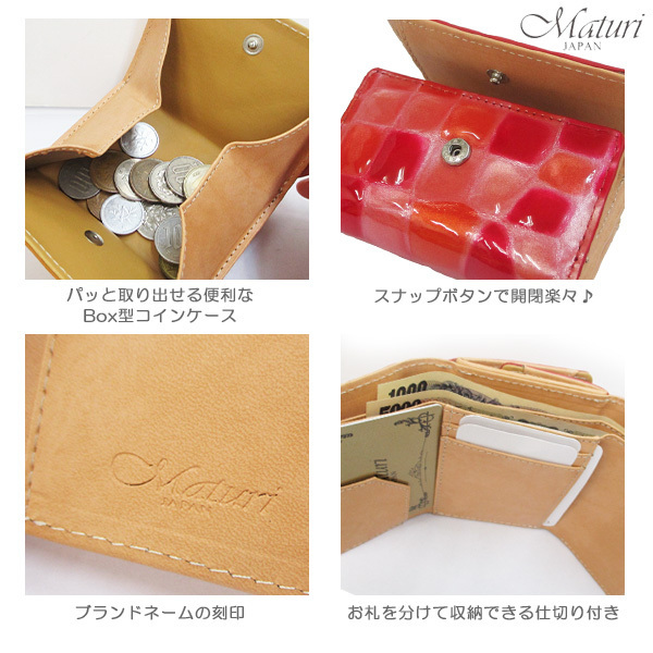手のひらに収まるサイズのミニウォレットは、 牛革を使用しているとは思えないほどのルックス。 ジュエリーのような可愛いカラーと、ぷっくりコロンとした手触りが女性の心を惹きつけます。 凹凸のあるエナメル加工で、多少の水滴もサッと拭き取れ、 トレンドのミニバッグにもスッと入ります。 コンビニやちょっとしたお買い物はポケットIN。 札入れには中仕切りがあり、お札とレシートに分けることもできます。 ボックス型のコインケースは小銭が見やすく出し入れもスムーズ。 もちろんカード収納もあり、手放せなくなる便利な極小ウォレットです。 ■定価21000円 ■カラー:レッド ■サイズ(約):縦8cm×横10cm×マチ3.5cm (商品によっては多少の誤差があります。予めご了承下さい) ■素材:外側/牛革(クロコ型押しエナメル加工)、内側/ボンテッドレザー ■仕様:スナップボタン開閉、札入れ×2(中仕切り)、カード入れ×2、フリーポケット×2、BOX型コインケース×1 ■付属:Maturi専用BOX ■新品・未使用 ※一部共通画像使用 【ご注意】 ※新品未使用ですが、製造過程により商品によっては細かな傷・汚れ、シワ・擦れ等がある場合がございます。 また、多少の縫製ゆがみ・ノリの付着につきましては不良ではございませんので、予めご了承下さい。 ※ご覧のモニターやブラウザの設定、照明等により、画像と実物の色合いが若干異なる場合がございます。 これらについては予めご理解頂いた上でご購入下さい。 | |