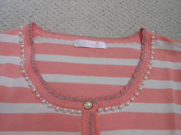 | ■ミューズ Mew's★可愛いパール&ラメ縁 ボーダー柄7分袖カーディガンなります。 ■お色は白×ピンクのボーダー柄になります。 サイズ表記はLです。バスト 86-94 身長 154-162 素材: レーヨン65% ナイロン35%(スリット糸使用) ■首回りはパール飾り♪ラメ入り縁&ボタンのパール系で、上品で可愛いです ■目立つようなシミ・汚れなどはなく、着用感もあまりなく、全体的とても綺麗な状態です。美品ですが、USEDとして上記の状態をご理解いただける方のご入札をお願いします。 | |||
