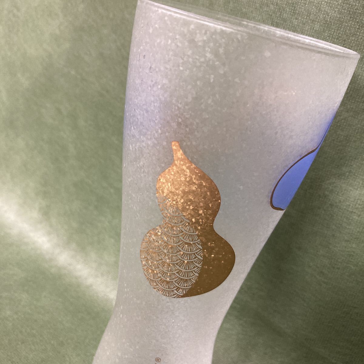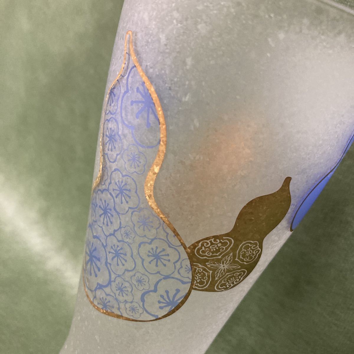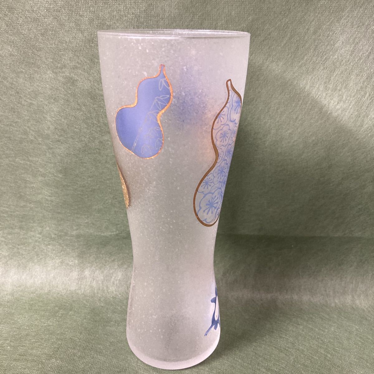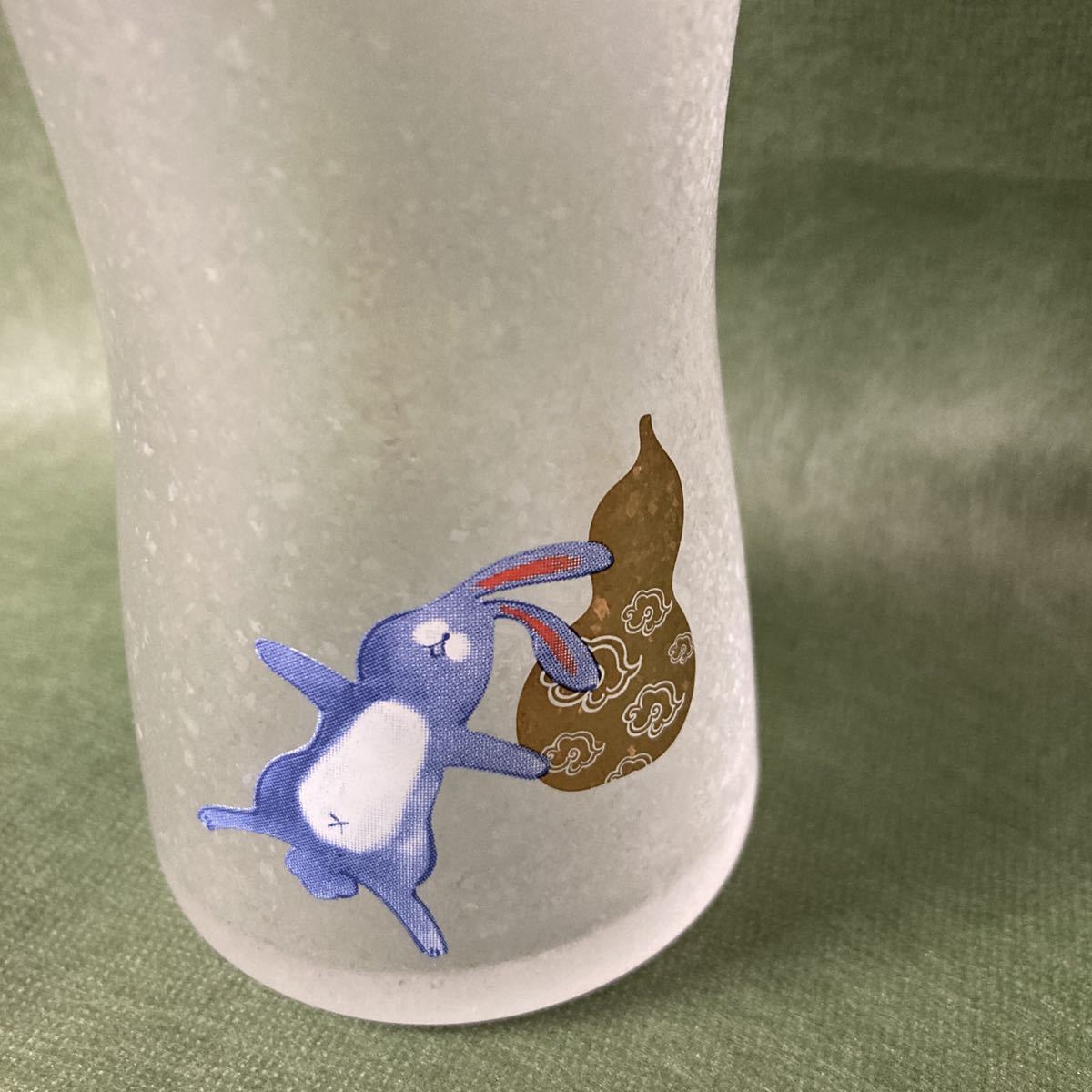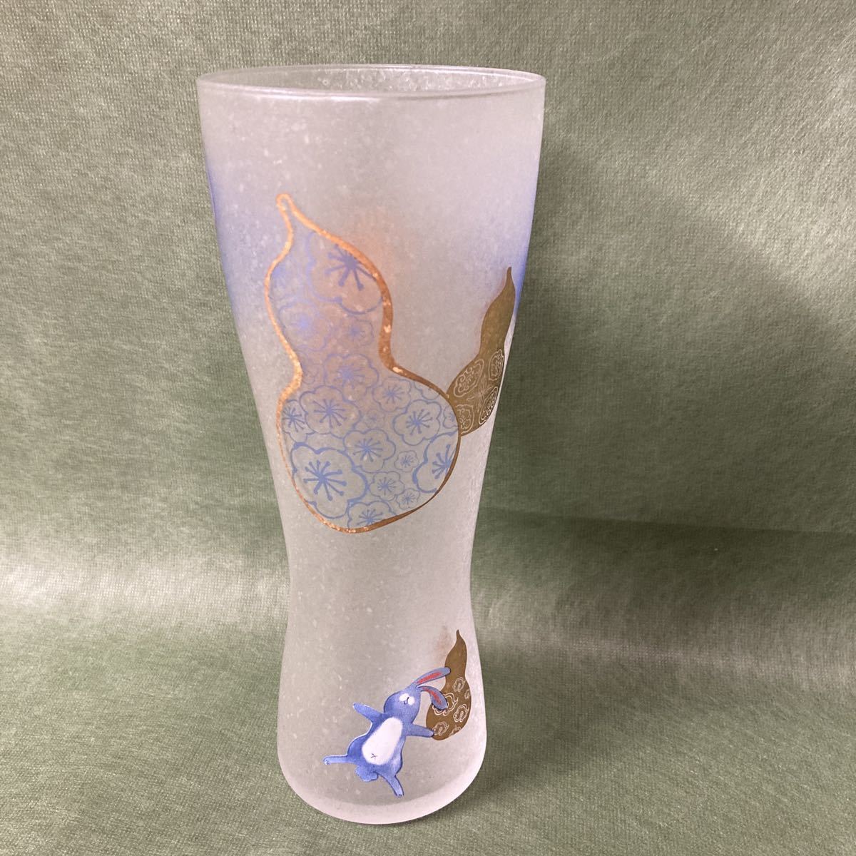 すりガラスのようなフワッとした風合いのグラスにひょうたん、うさぎがプリントされています。