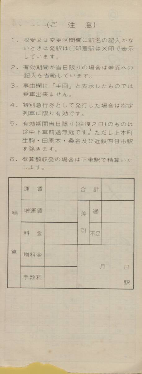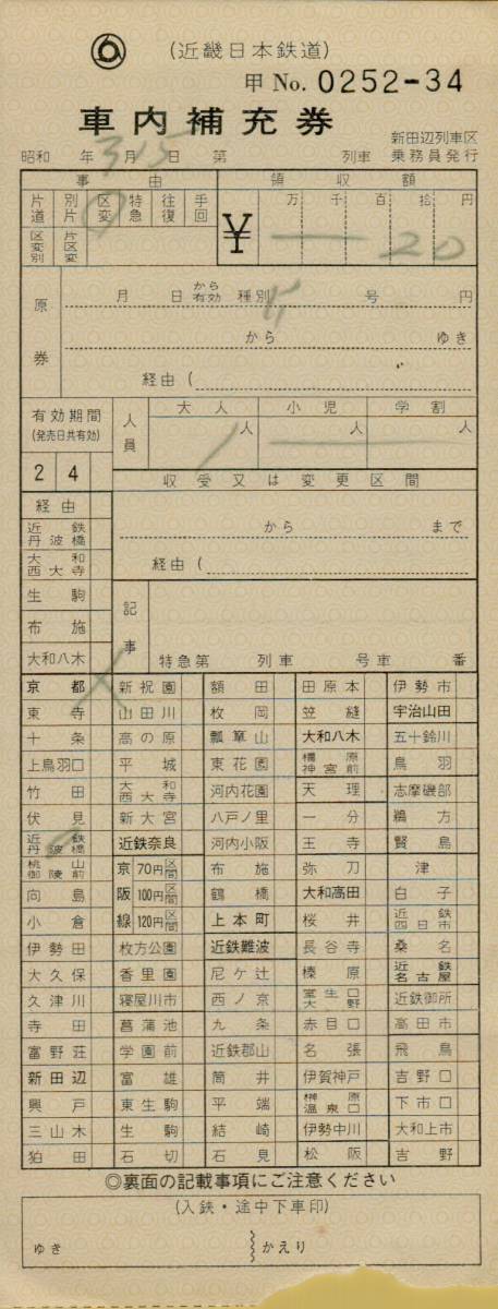 ▲ 近畿日本鉄道 【 車内補充券 】 新田辺 列車区 乗務員 発行 駅名選択式
