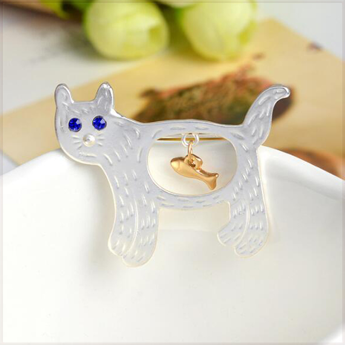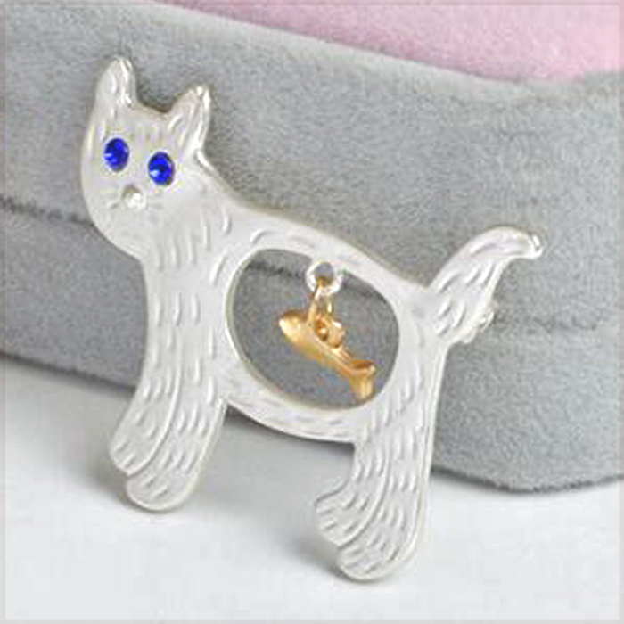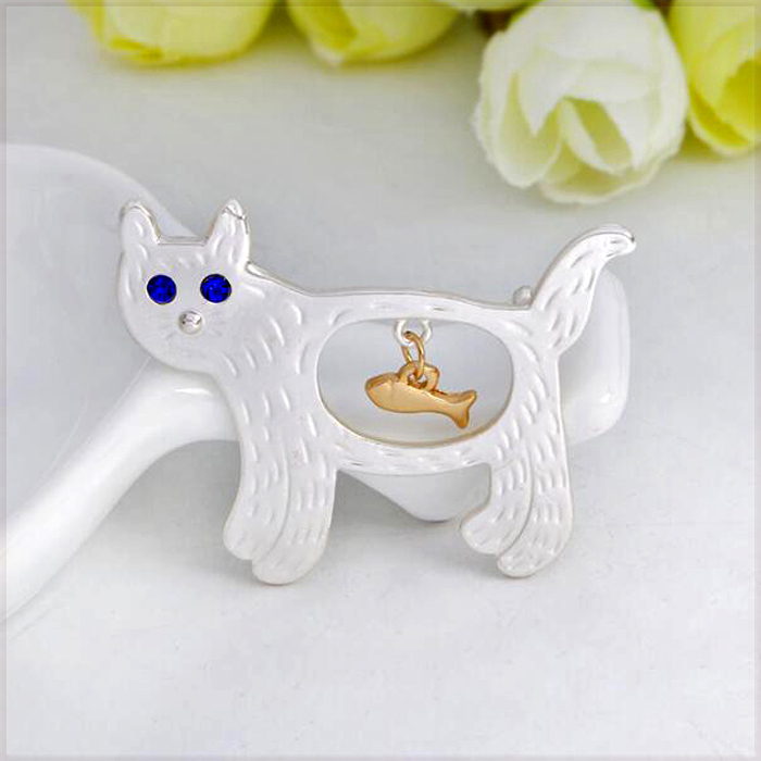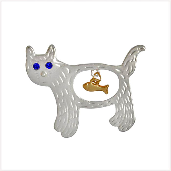 [BROOCH] Blue Eyes Lovely Cat Fish 青い目の銀色の猫と金色の魚 かわいい ねこちゃん と さかな デザイン ブローチ 【送料無料】