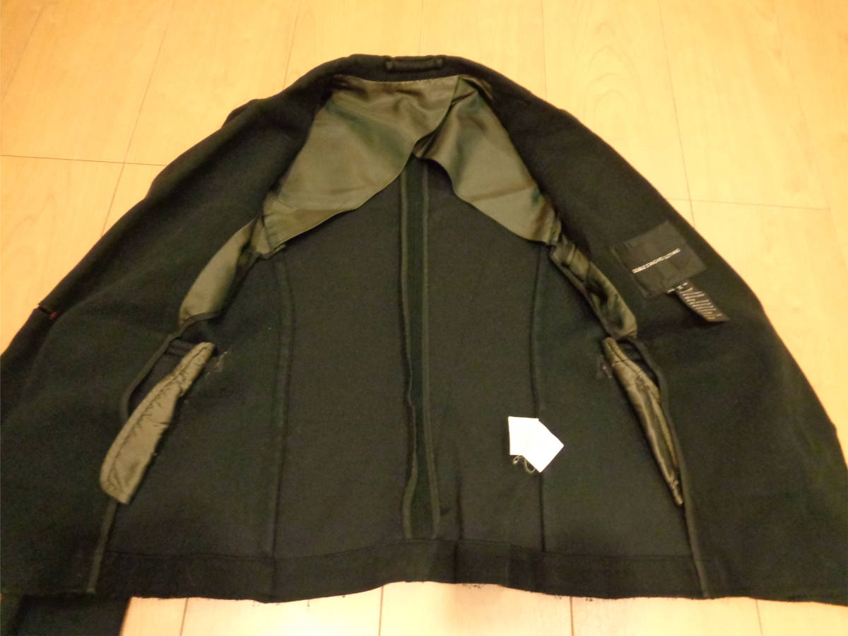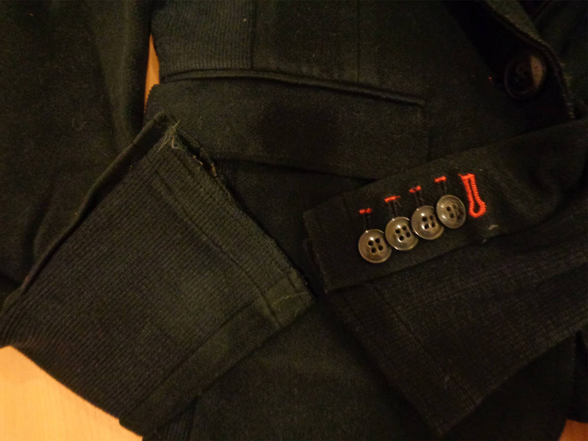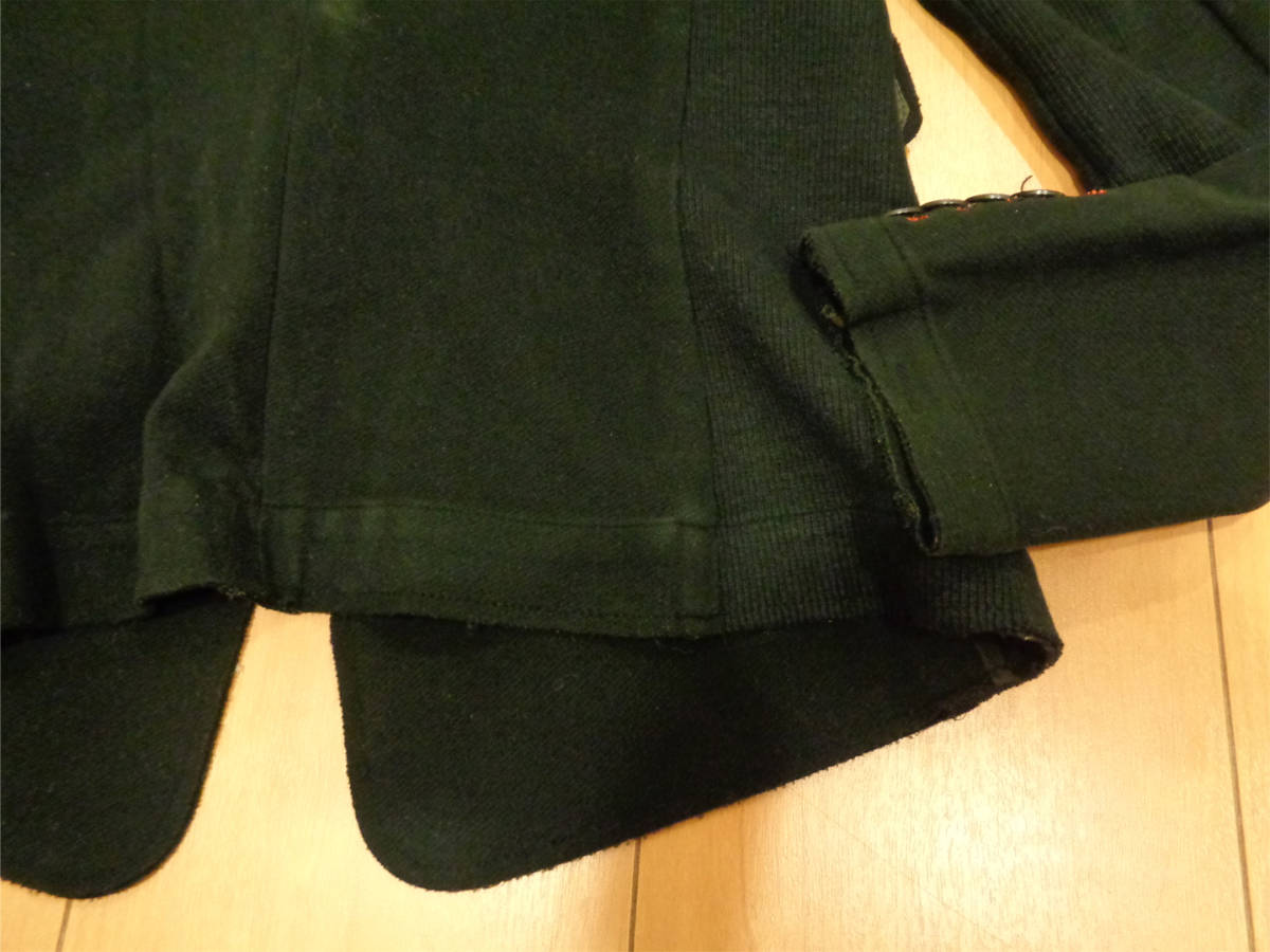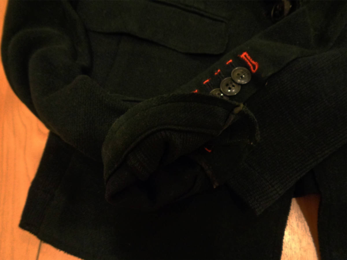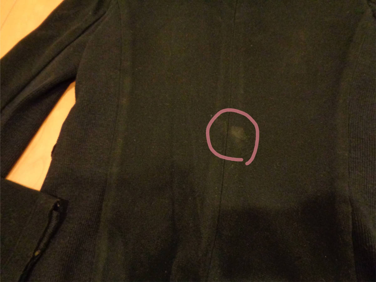 何度か着用の中古品になります。切りっぱなしの仕様のヶ所、裾には毛玉の付着があります。8枚目の写真にも写しましたが、白っぽい円がうすらあります。写真を撮る際にフラッシュを使用して撮ったので、実際よりも白っぽく写ってしまいました。他にも近くで見るとうすら色褪せがある箇所はあります。また、裾の方などなんとなしの型崩れは見られます。毛羽立ちは感じませんでした。