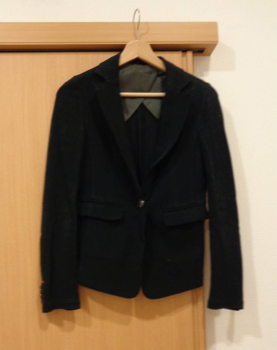 サイズは36でPROPORTION BODY DRESSINGのニット系ジャケットになります。肩パッドはついてません。色は黒です。裏地は首周りに部分的についてますが、全体的にはついてなく、ノビノビ系の商品です。