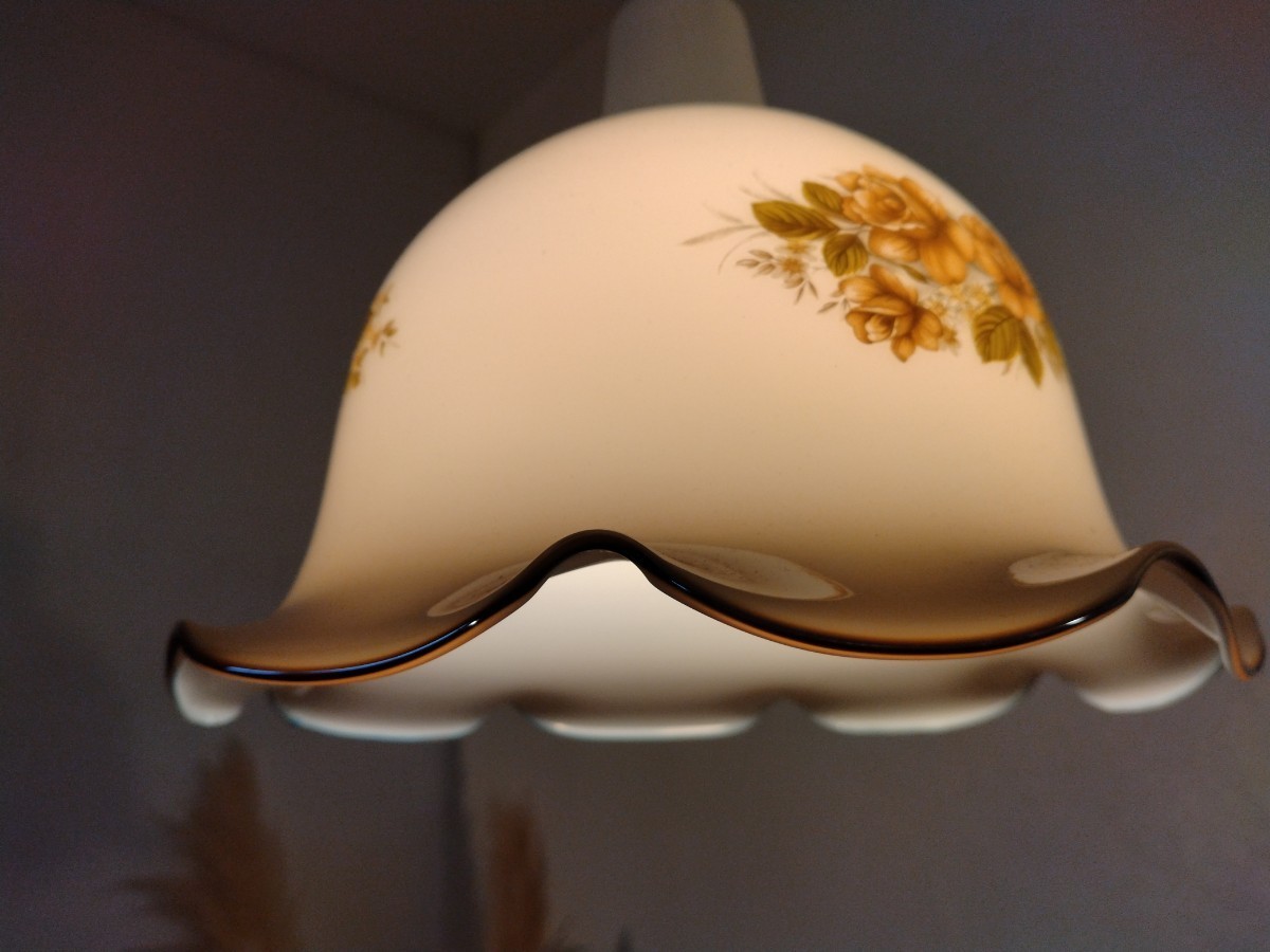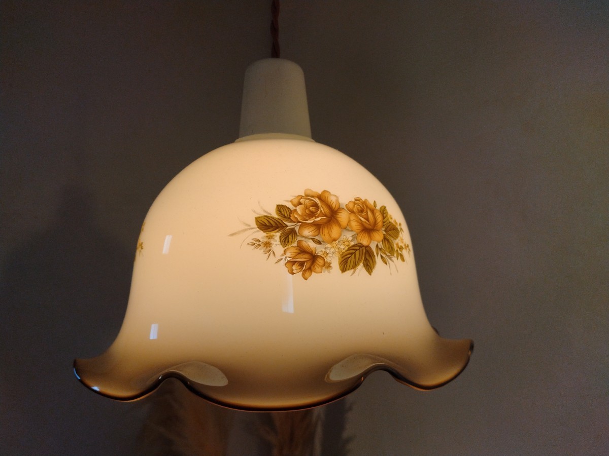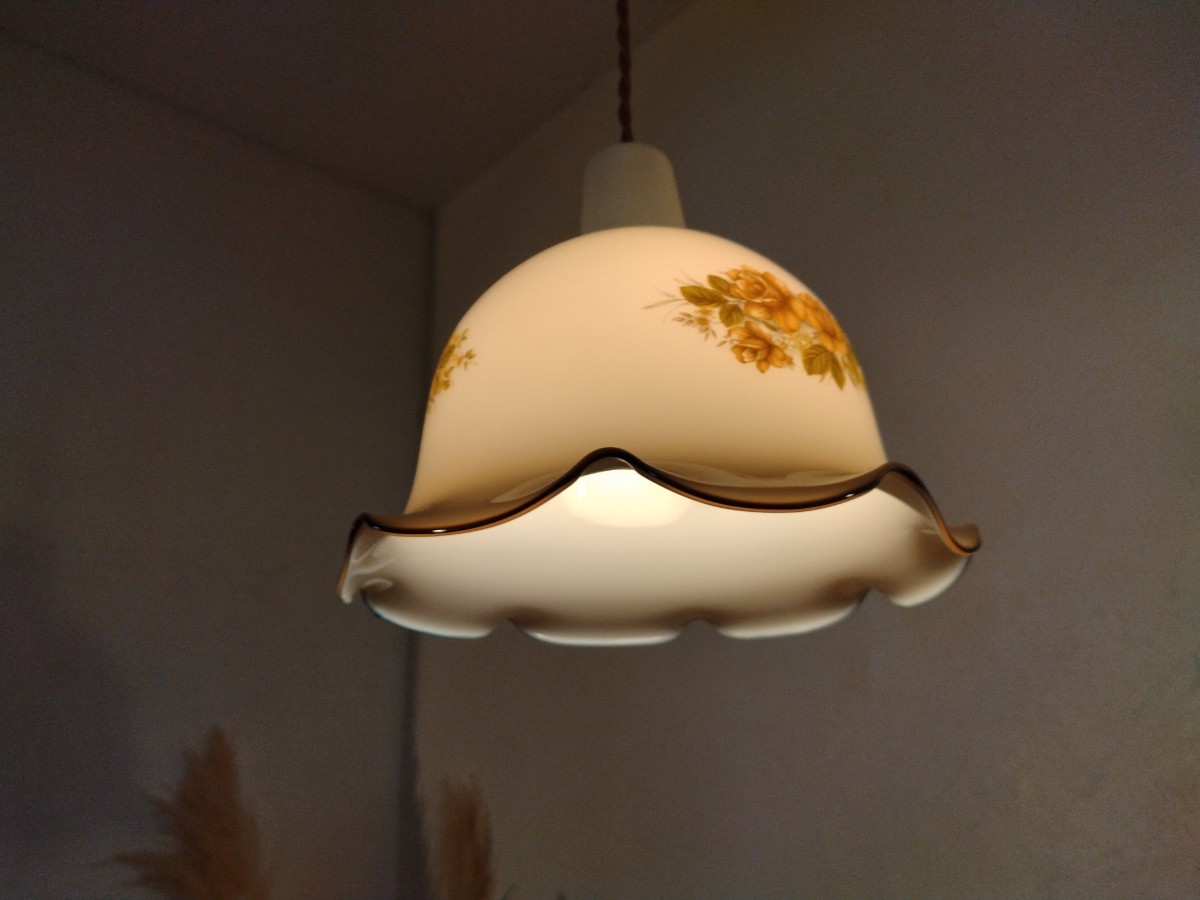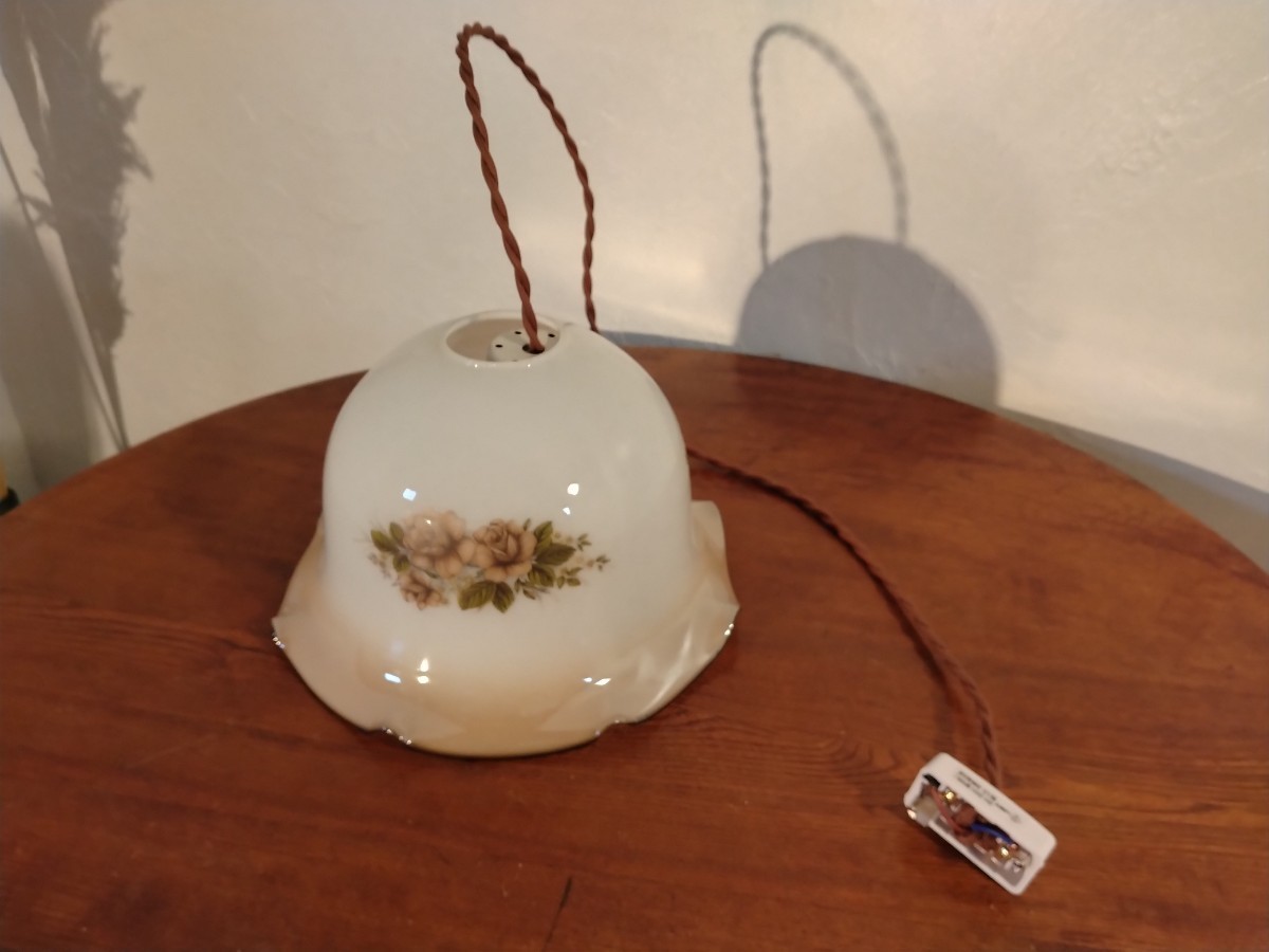 1212-10 フレンチスタイル/花柄デザインガラス/渕波/吊り下げペンダントライト①/配線新品交換済み