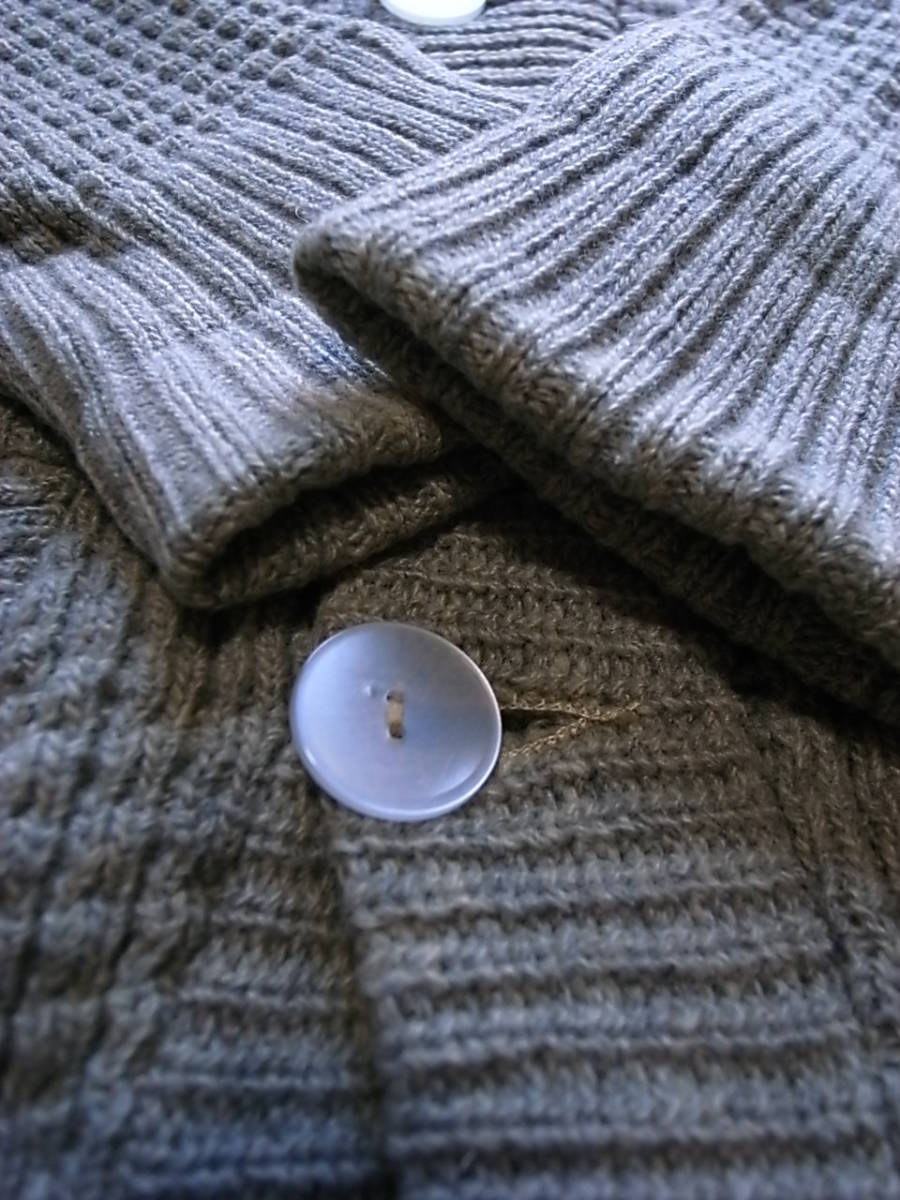 大袈裟にならない、バランスの良い小さ目のショールカラー、着用感もタイトでIVY系。ポケット2つ。無地