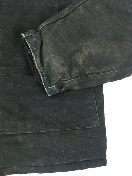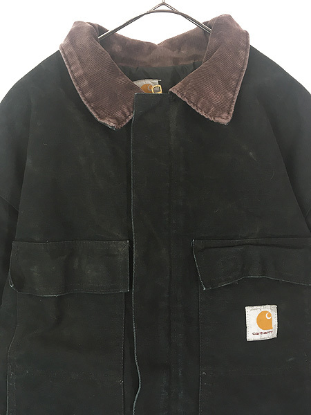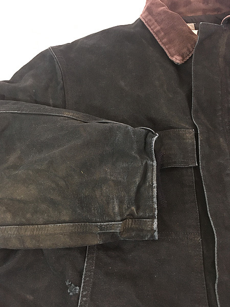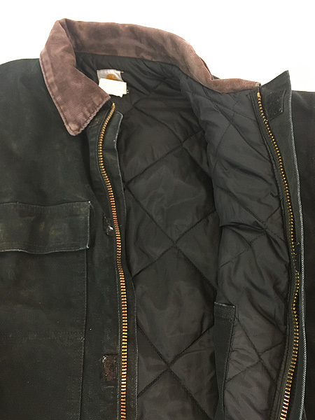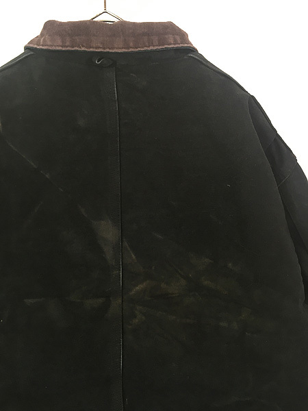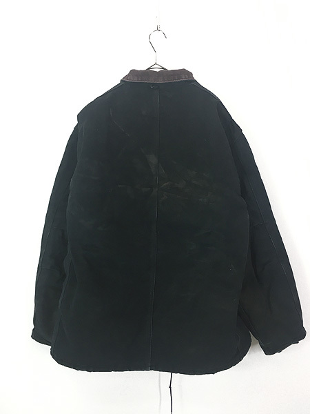 襟コーデュロイ、フロントはジップとベルクロの二重構造、ウエスト内側にドローコード、裏地は中綿入り黒のナイロンキルティング、袖内側リブ付きで防寒性も期待できます。