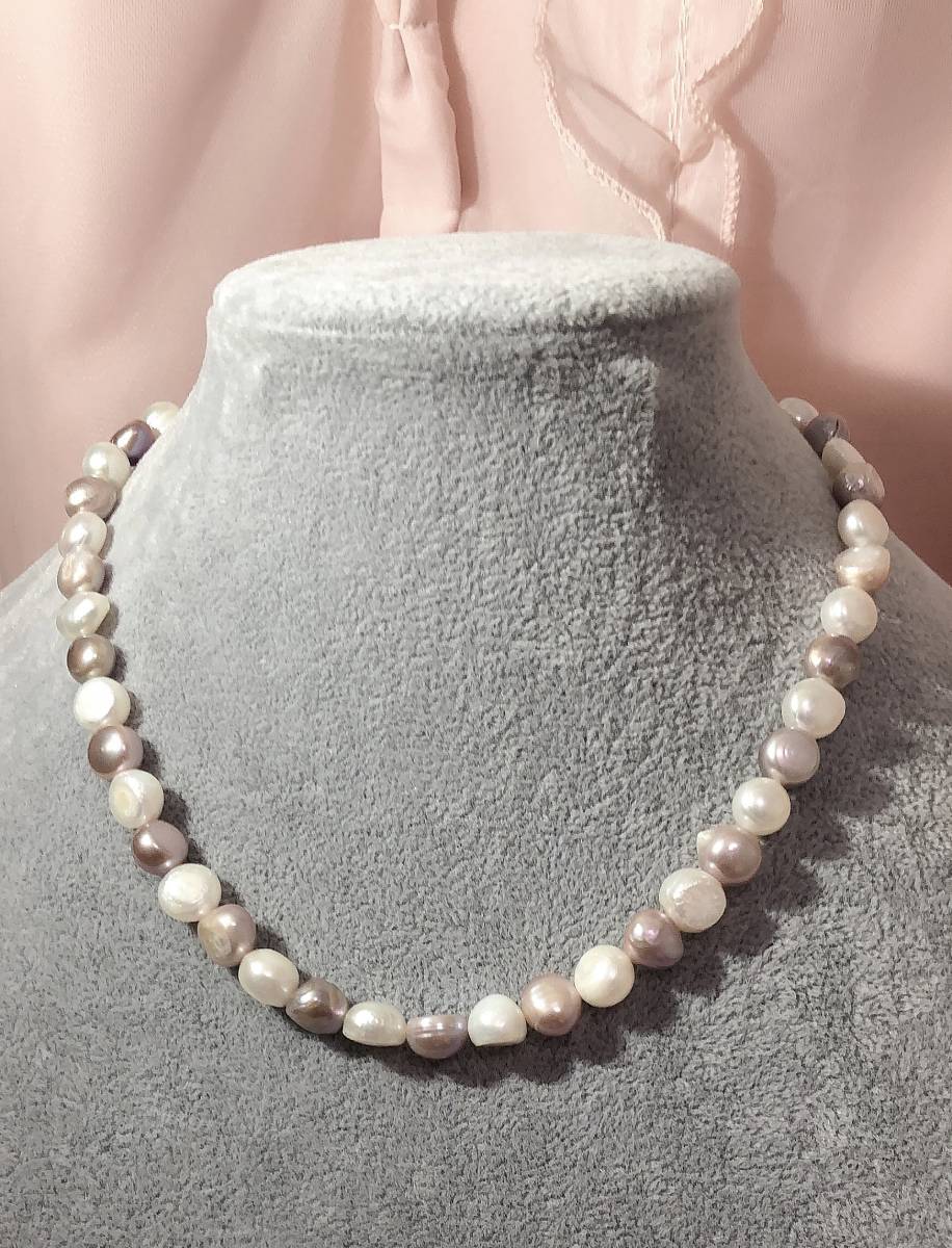 本物♪本真珠♪新品未使用♪●商品名:大粒♪9-10mm珍しい天然淡水真珠/バロックパールネックレス石目の素材:天然淡水真珠色調:天然ホワイト、天然サクラピンク●サイズ: 珠約9-10mm ●長さ:約40cm●照り:とても良い●形:バロック●キズ(えくぼう):天然淡水真珠特有な凸凹若干あり●止具の素材:ステンレス●貴女らしさを輝かせる、自慢のアクセサリー●一粒一粒の楽しい真珠。真珠豆知識◆長い年月をかけて育まれる稀少な大粒パール淡水パールは核がないため、丸い近い形で育つものは非常に稀。バロック型といわれる、いびつな形のものが一般です。しかも7-9mmの大きさになるまでは5~6年もの長い年月がかかります。約8年もかかる10mm玉となる と、1万個にひとつしか出来ない稀少な名品です。◆貝核を使用せず、すべて真珠層で出来ているのが特徴。養殖される真珠のほとんどは玉の中の「貝核」を中心として真珠層を作ります。8mmの真珠の場合、貝核の大きさ は7.5mmくらいなので真珠層はわずかしかありません。淡水パールはこの「貝核」を用いずに養殖されるので、一 粒すべてが真珠層でできているのです。◆真珠の美しさは特別です。シルクなように滑らかな光沢と表面を舞う虹色の光彩がそれを物語っています。