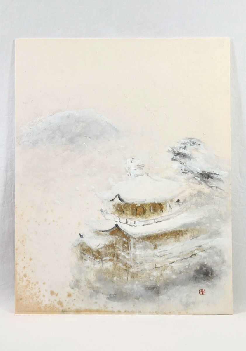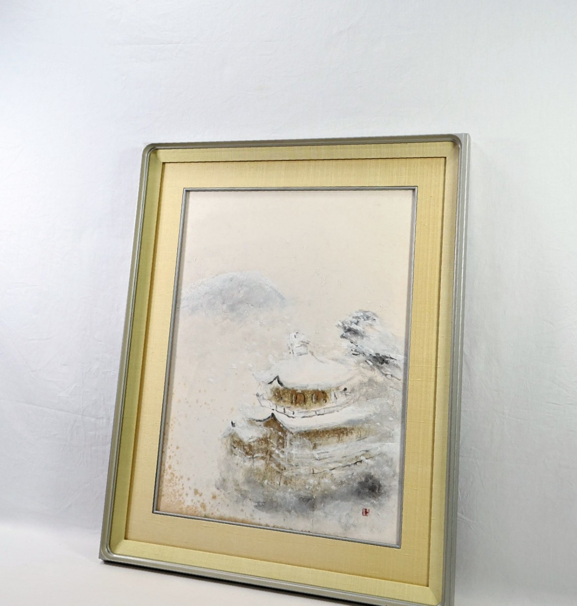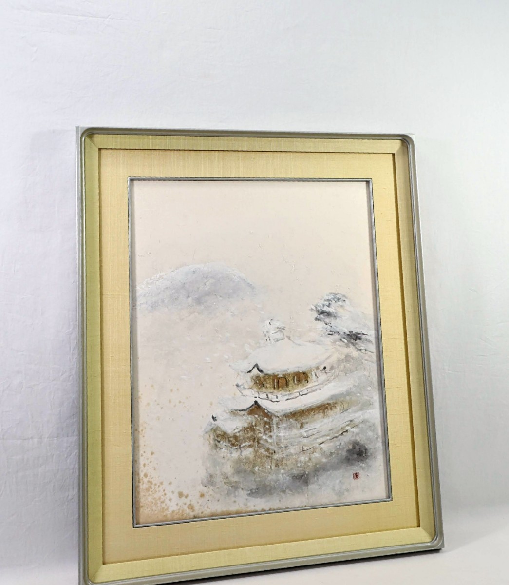 真作 松尾冬青 日本画「雪景金閣寺」画 47×60cm 12号 京都府出身 日本美術院特待 降り頻る雪の中、一面雪化粧の鹿苑寺と衣笠山の冬景 8081