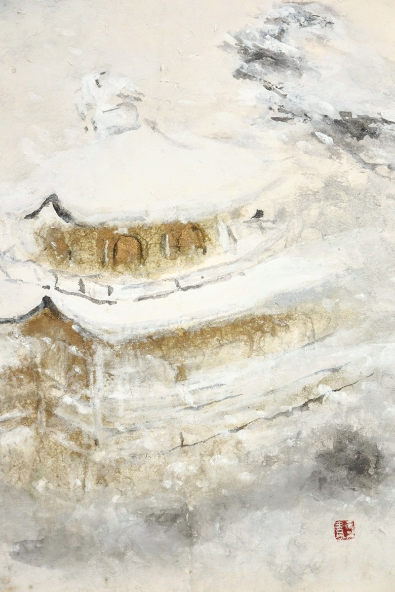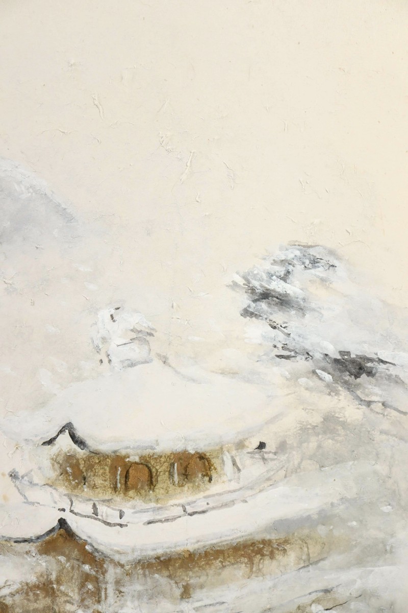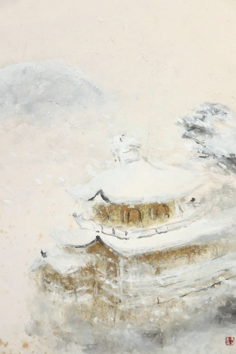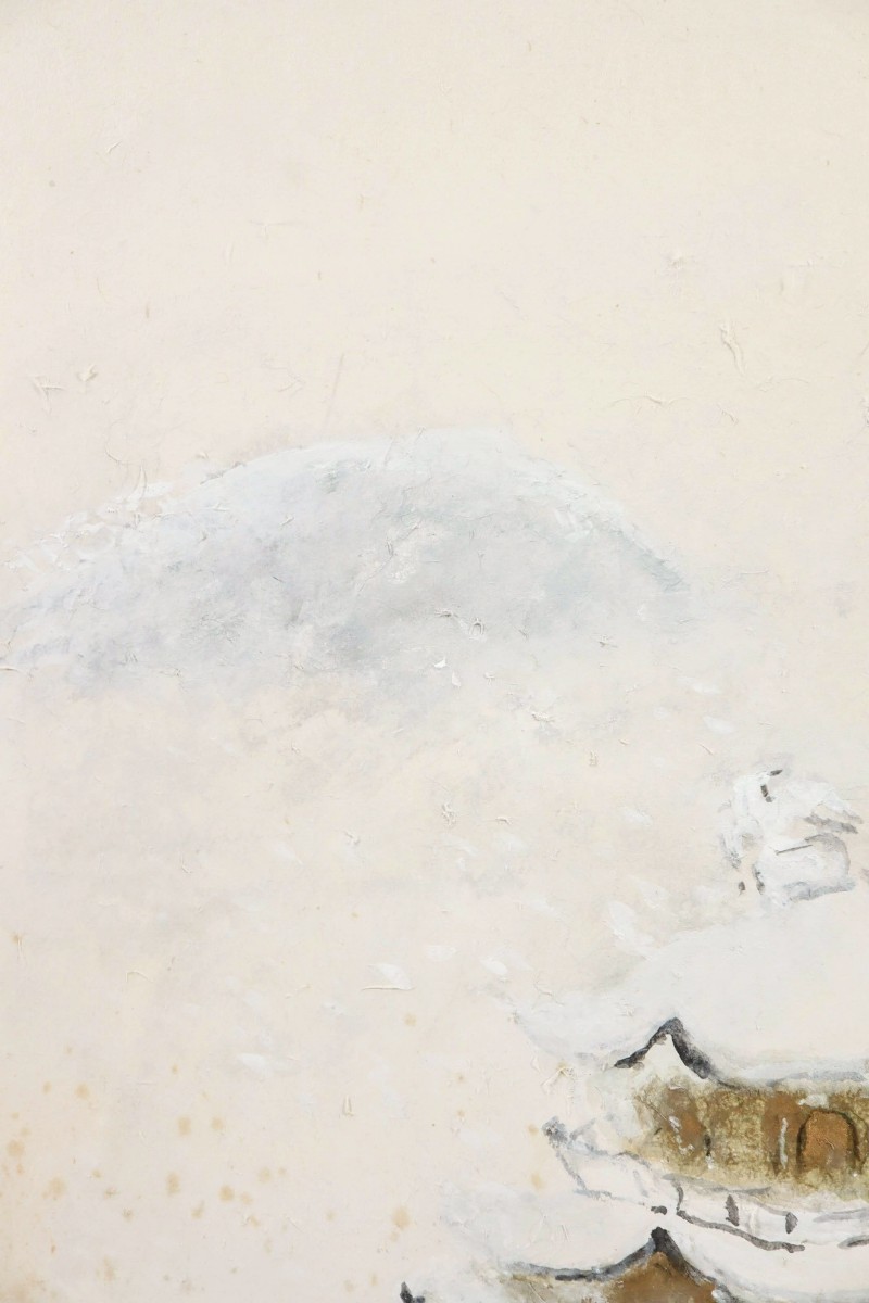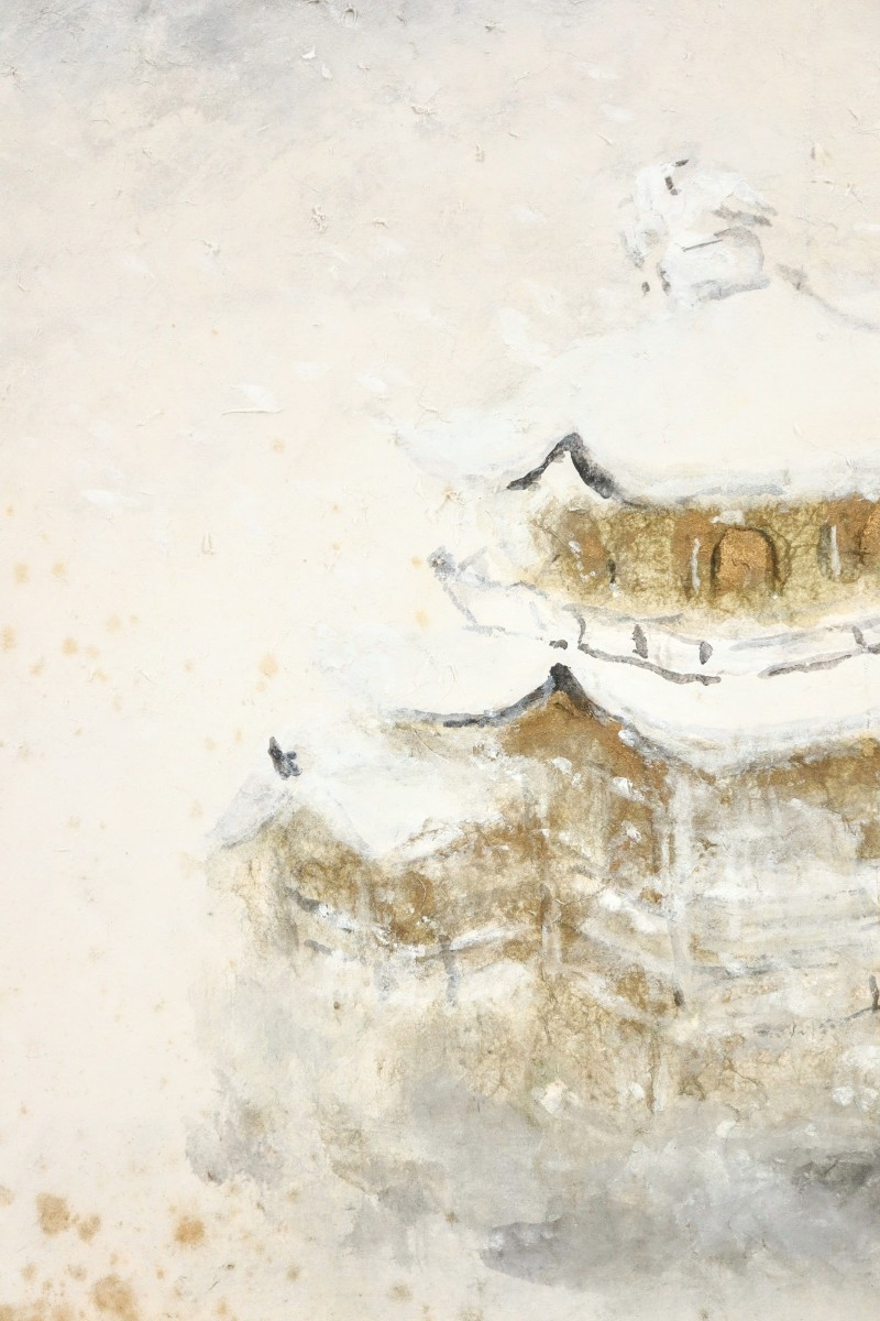 降り頻る雪の中、一面雪化粧の鹿苑寺と衣笠山を描いた