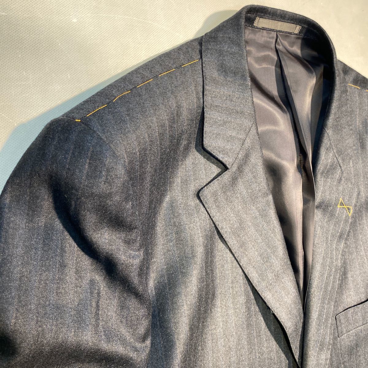 水牛釦、AMFステッチ、脇当て刺繍、切り台場仕立てなど、百貨店向けならではのオーダーメイド並みの最上級仕立てで仕上げられております。ファブリックはErmenegildo Zegna 社のHERITAGEを使用。