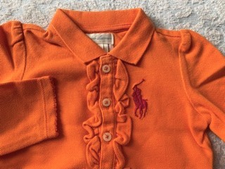 きれいなオレンジ、左胸にピンクのマークの刺繍、首元がフリル風、