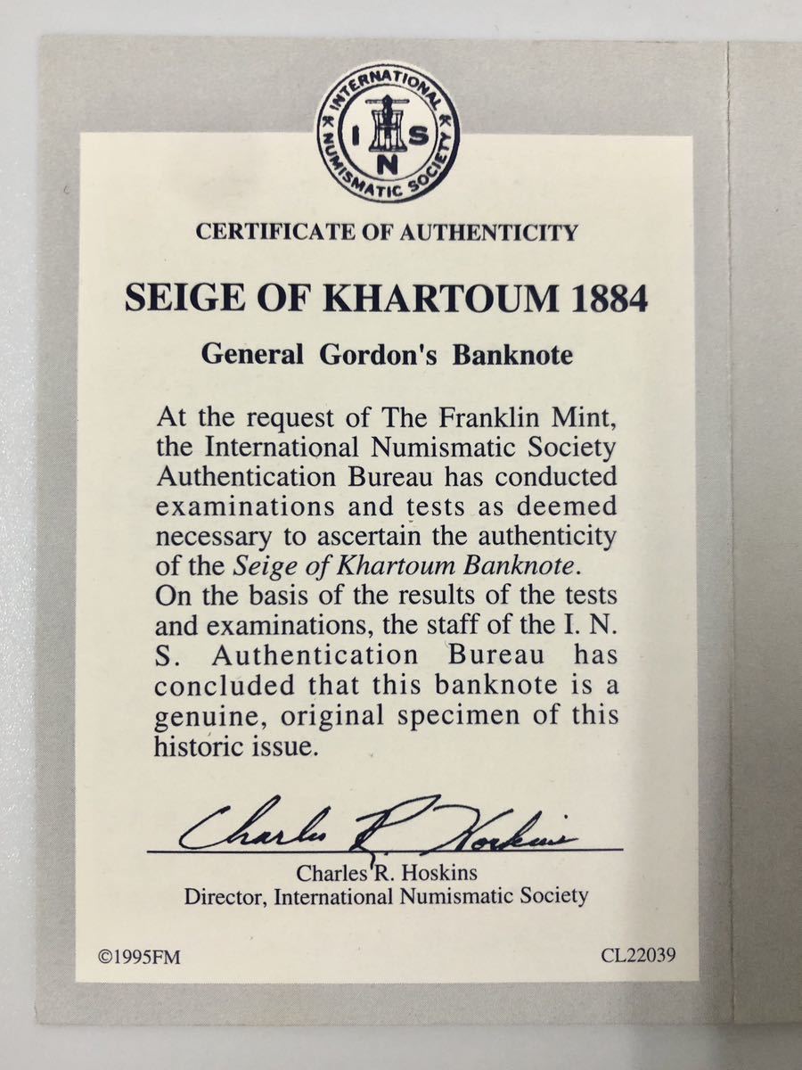 【希少】イギリス ゴードン将軍 スーダン ハルツーム攻囲の紙幣 古紙幣 直筆署名入り紙幣 Siege of Khartoum currency 1884年